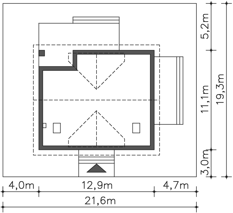 Grafika przedstawia minimalne wymiary działki. Aby sprawdzić, czy dom może być realizowany na konkretnej działce należy uzyskać Wypis i Wyrys z Miejscowego Planu Zagospodarowania Przestrzennego lub jeśli na danym terenie nie ma planu – Decyzję o warunkach zabudowy. Wszystkie projekty wymagają adaptacji do warunków miejscowych przez projektanta lokalnego.