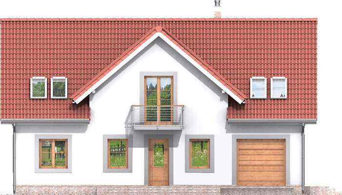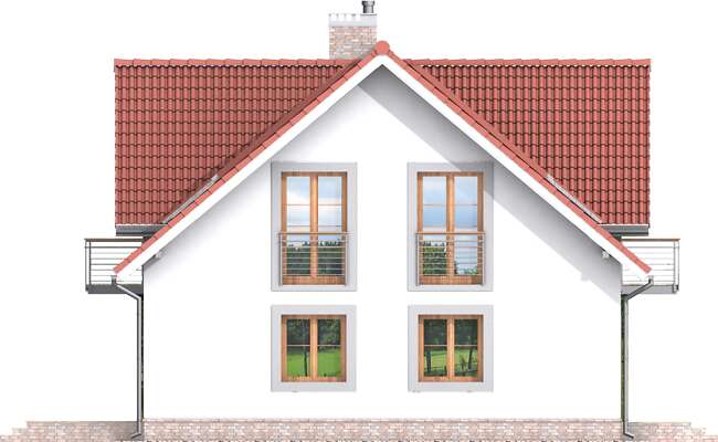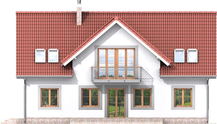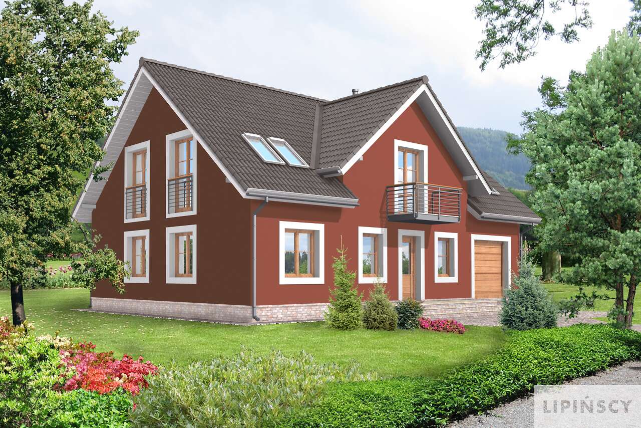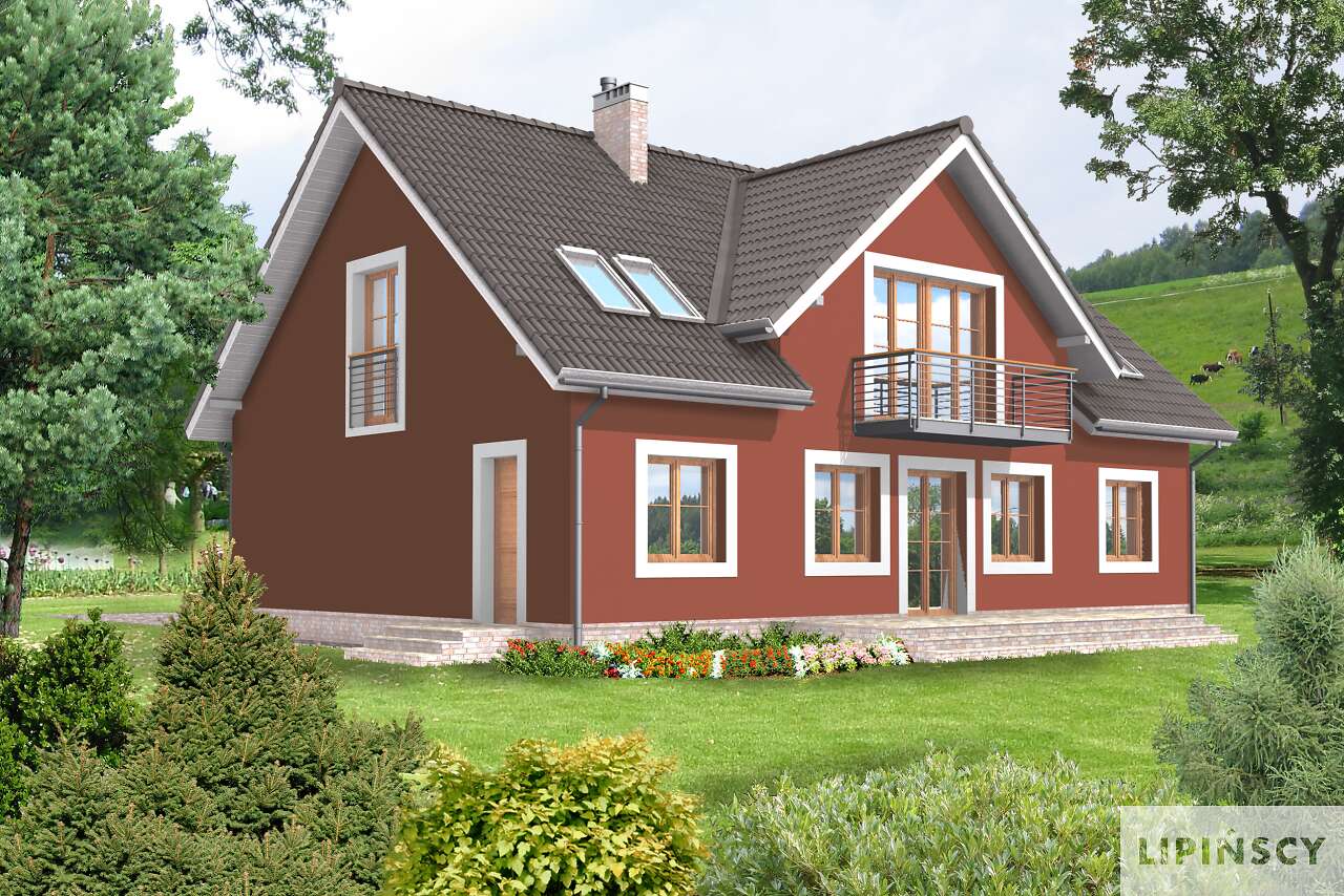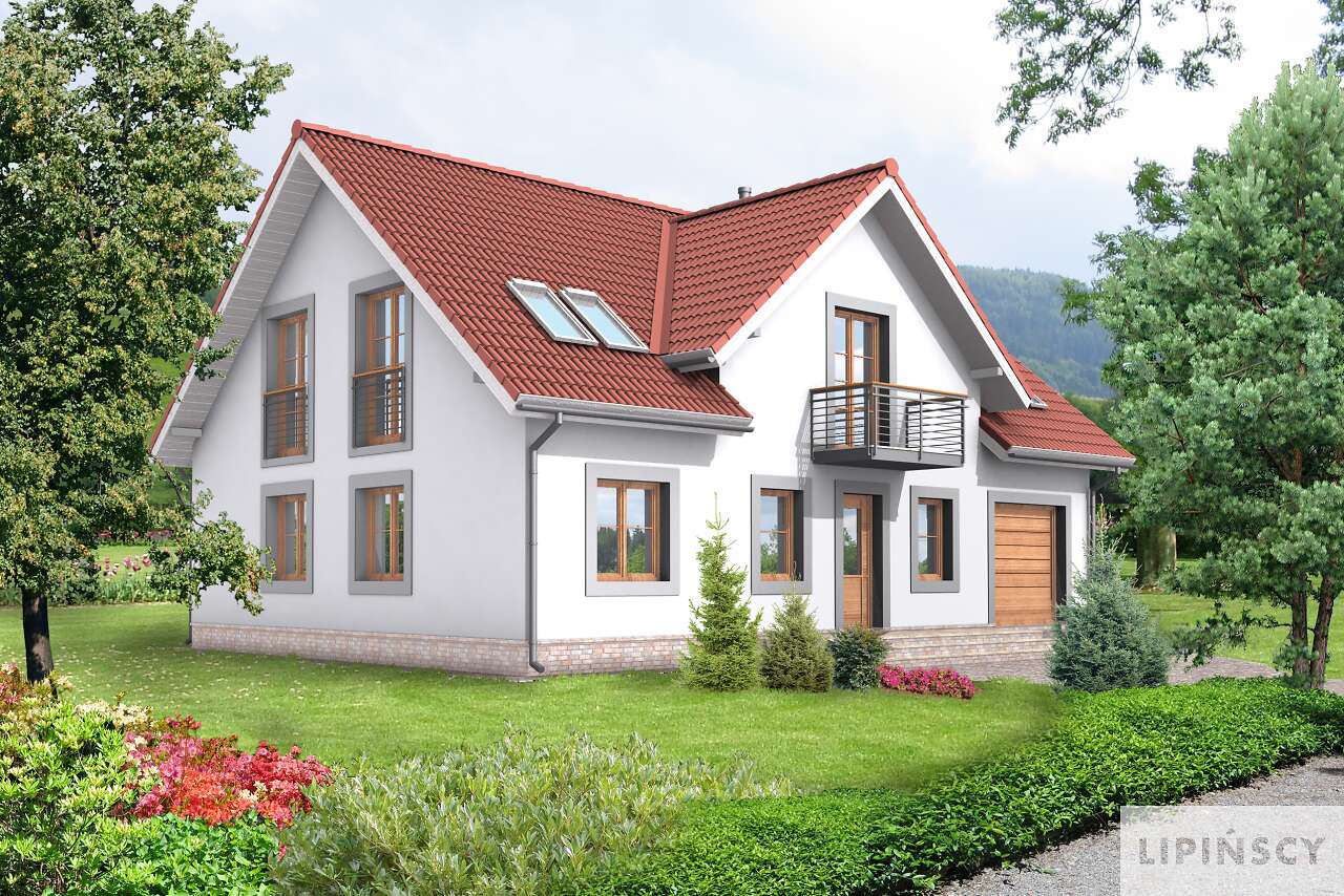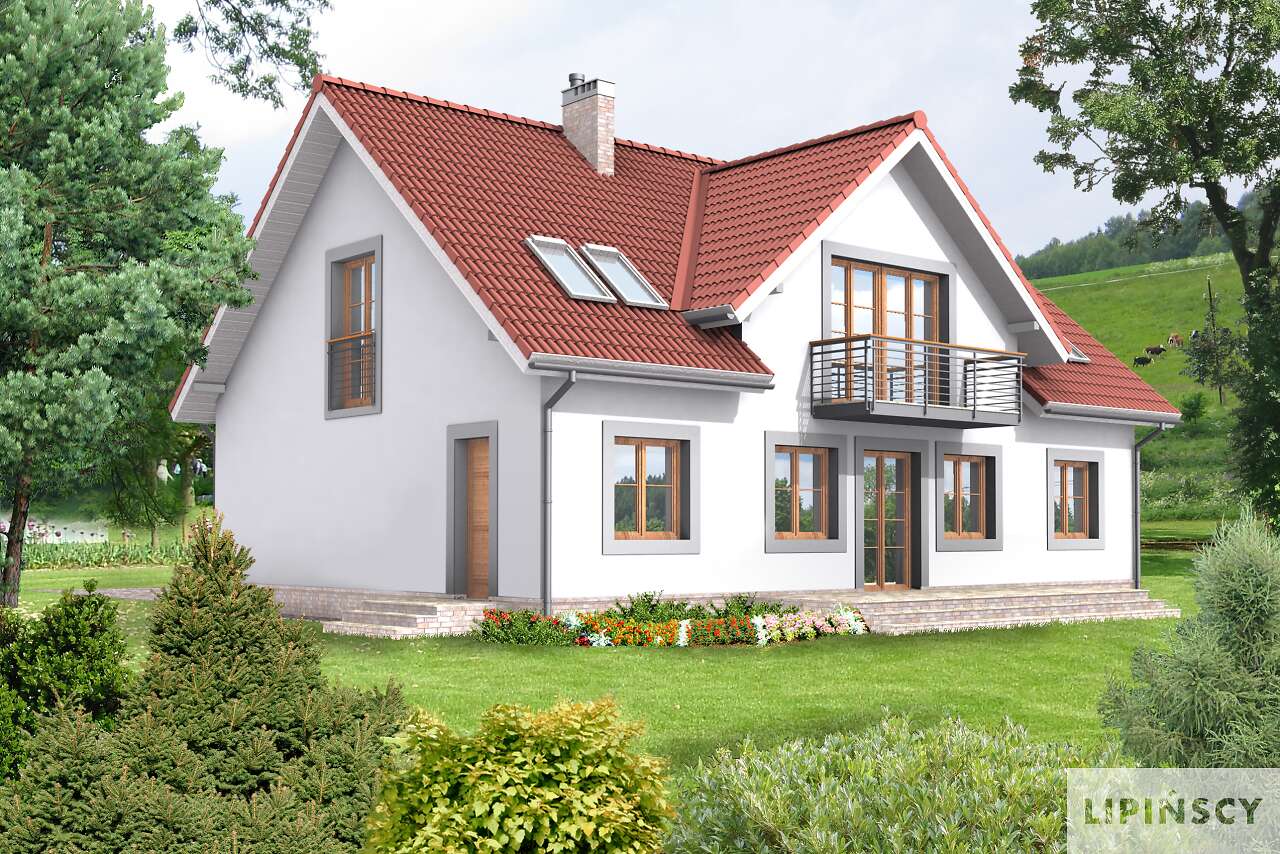 Klasyczny dom o pięknie skomponowanych elewacjach, które odznaczają się wyważonymi proporcjami i subtelnym detalem. Układ funkcjonalny jest wyraźnie podzielony na strefę dzienną i nocną. Otwarta przestrzeń pokoju dziennego z jadalnią, kominkiem i wyjściem na zadaszony taras, to strefa dzienna uzupełniona dużą kuchnią. Na poddaszu natomiast znajdują się cztery sypialnie, z czego jedna posiada własną łazienkę i łazienka ogólnodostępna z suszarnią.