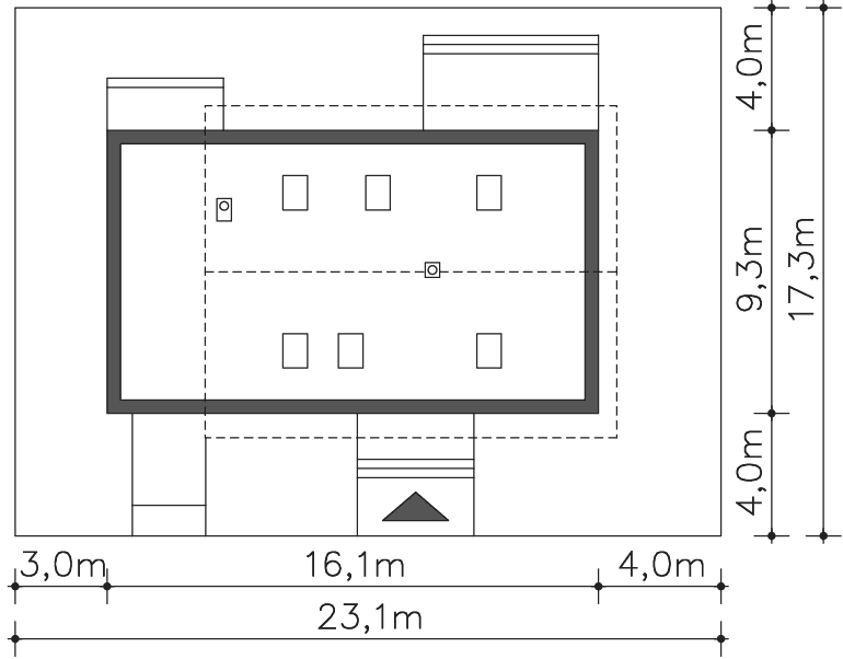Grafika przedstawia minimalne wymiary działki. Aby sprawdzić, czy dom może być realizowany na konkretnej działce należy uzyskać Wypis i Wyrys z Miejscowego Planu Zagospodarowania Przestrzennego lub jeśli na danym terenie nie ma planu – Decyzję o warunkach zabudowy. Wszystkie projekty wymagają adaptacji do warunków miejscowych przez projektanta lokalnego.