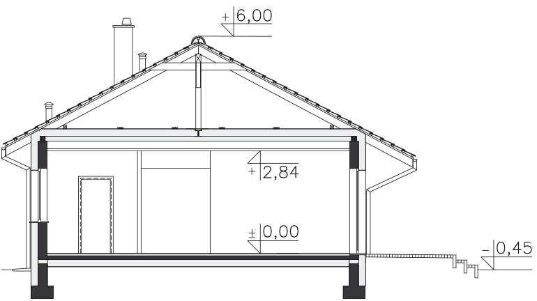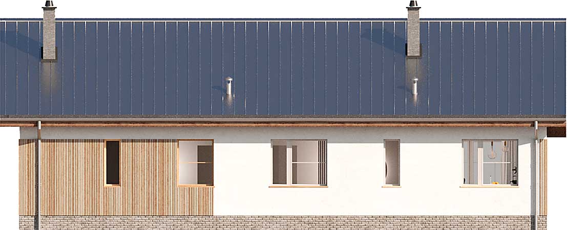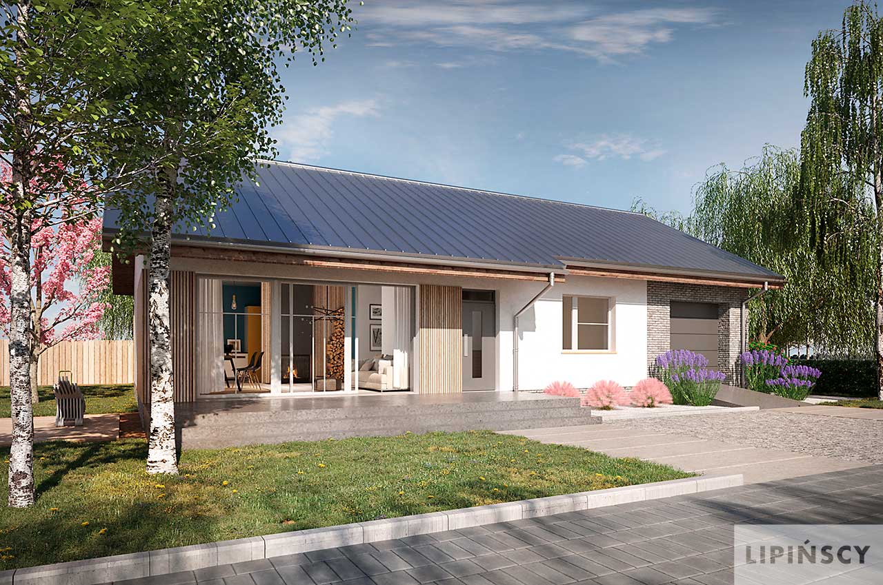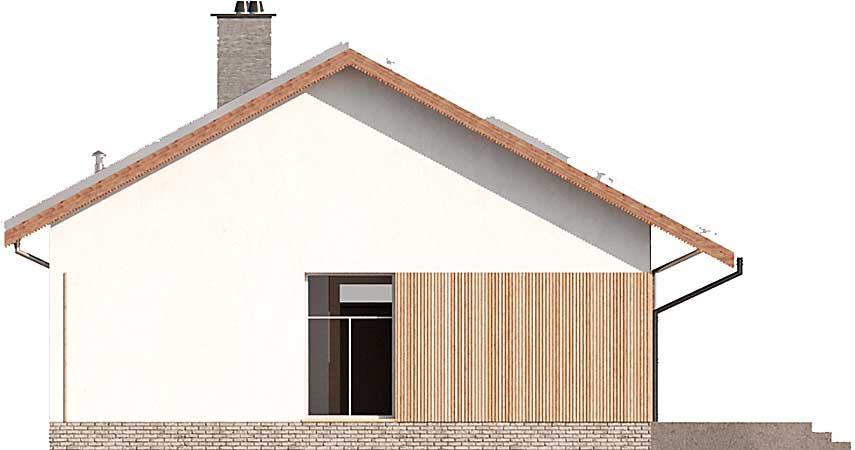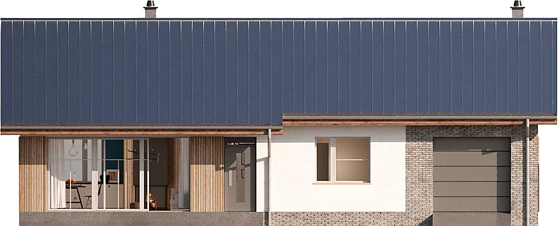 Projekt domu Royan VII to wersja projektu z wejściem od południa. Parterowy budynek z dwuspadowym dachem na rzucie prostokąta będzie świetnym wyborem dla niewielkiej rodziny lub pary. Dwie sypialnie z łazienką oraz otwarta strefa dzienna z kominkiem i spiżarką przy kuchni tworzą wygodną przestrzeń mieszkalną. Największe okna w pokoju dziennym zlokalizowane są od frontu i wychodzą na duży taras, z którego prowadzi również wejście do domu. Do budynku dostawiony jest garaż jednostanowiskowy z kotłownią gazową w pomieszczeniu za garażem. Projekt przewiduje również wentylację mechaniczną - rekuperację, co w połączeniu z doskonałą izolacją domu wpływa na obniżenie kosztów ogrzewania.