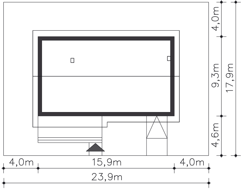 Grafika przedstawia minimalne wymiary działki. Aby sprawdzić, czy dom może być realizowany na konkretnej działce należy uzyskać Wypis i Wyrys z Miejscowego Planu Zagospodarowania Przestrzennego lub jeśli na danym terenie nie ma planu – Decyzję o warunkach zabudowy. Wszystkie projekty wymagają adaptacji do warunków miejscowych przez projektanta lokalnego.