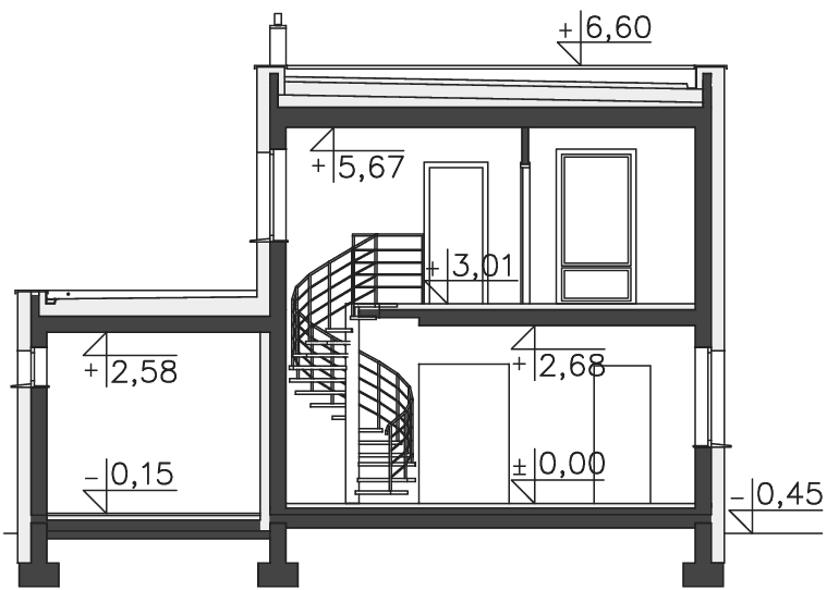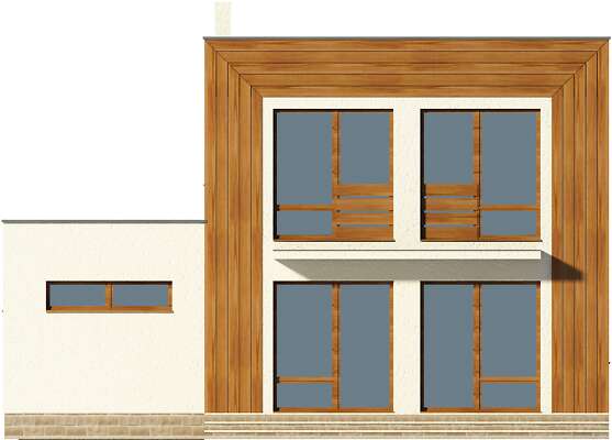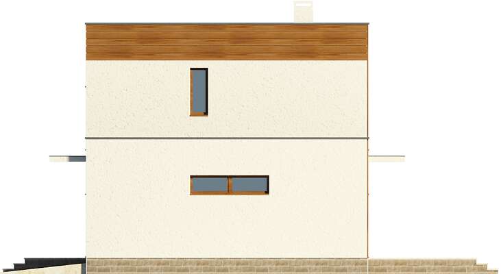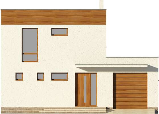 Funkcjonalny i nowoczesny dom jednorodzinny z płaskim dachem, przewidziany w standardzie energooszczędnym, idealny dla niewielkiej rodziny. Parter w całości przeznaczono na jedną część wspólną, do której należy kuchnia, jadalnia i salon z przeszklonym wyjściem na taras. Kręcone schody dodają pomieszczeniu uroku i prowadzą na drugą kondygnację, gdzie znajdują się trzy sypialnie i łazienka. W zwartą, prostą bryłę domu wpisano garaż na jedno auto, za którym znajduje się kotłownia.