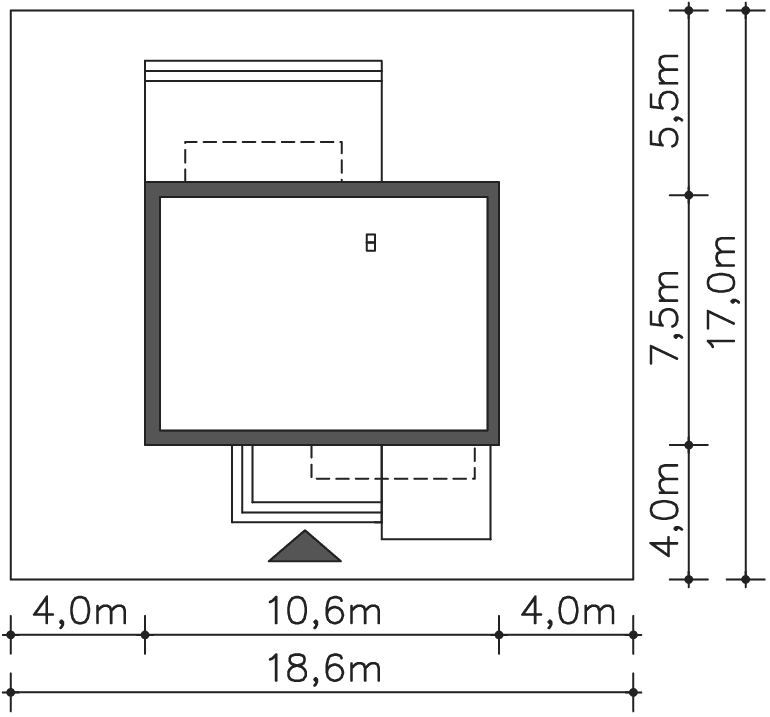 Grafika przedstawia minimalne wymiary działki. Aby sprawdzić, czy dom może być realizowany na konkretnej działce należy uzyskać Wypis i Wyrys z Miejscowego Planu Zagospodarowania Przestrzennego lub jeśli na danym terenie nie ma planu – Decyzję o warunkach zabudowy. Wszystkie projekty wymagają adaptacji do warunków miejscowych przez projektanta lokalnego.