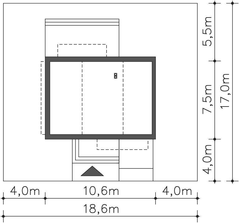 Grafika przedstawia minimalne wymiary działki. Aby sprawdzić, czy dom może być realizowany na konkretnej działce należy uzyskać Wypis i Wyrys z Miejscowego Planu Zagospodarowania Przestrzennego lub jeśli na danym terenie nie ma planu – Decyzję o warunkach zabudowy. Wszystkie projekty wymagają adaptacji do warunków miejscowych przez projektanta lokalnego.