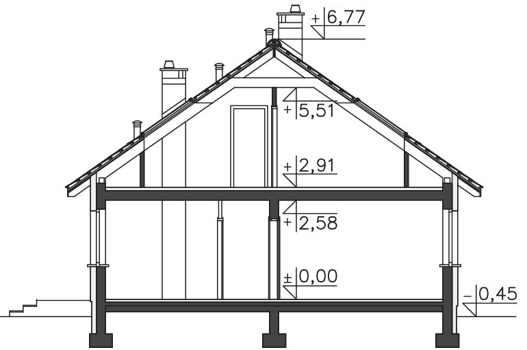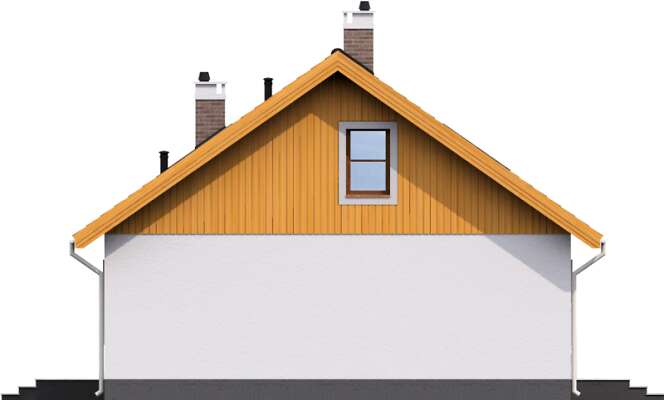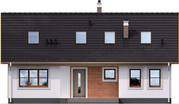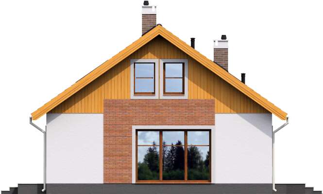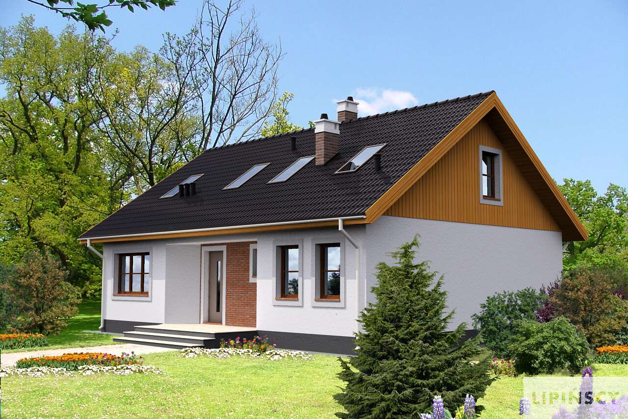 Piękny dom z użytkowym poddaszem, o zwartej, prostej bryle i funkcjonalnym wnętrzu. Duże przeszklenia dodają budynkowi lekkości i sprawiają, że w środku jest dużo dziennego, naturalnego światła. Na parterze znajduje się obszerny salon z kominkiem, sąsiadujący z półotwartą kuchnią, z miejscem na stół, dwie sypialnie, łazienka, spiżarnia, pomieszczenie gospodarcze i wc. Poddasze to część nocna, gdzie są trzy wygodne sypialnie, garderoba i komfortowa, doświetlona oknem połaciowym łazienka.