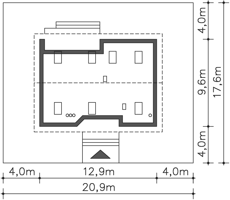 Grafika przedstawia minimalne wymiary działki. Aby sprawdzić, czy dom może być realizowany na konkretnej działce należy uzyskać Wypis i Wyrys z Miejscowego Planu Zagospodarowania Przestrzennego lub jeśli na danym terenie nie ma planu – Decyzję o warunkach zabudowy. Wszystkie projekty wymagają adaptacji do warunków miejscowych przez projektanta lokalnego.