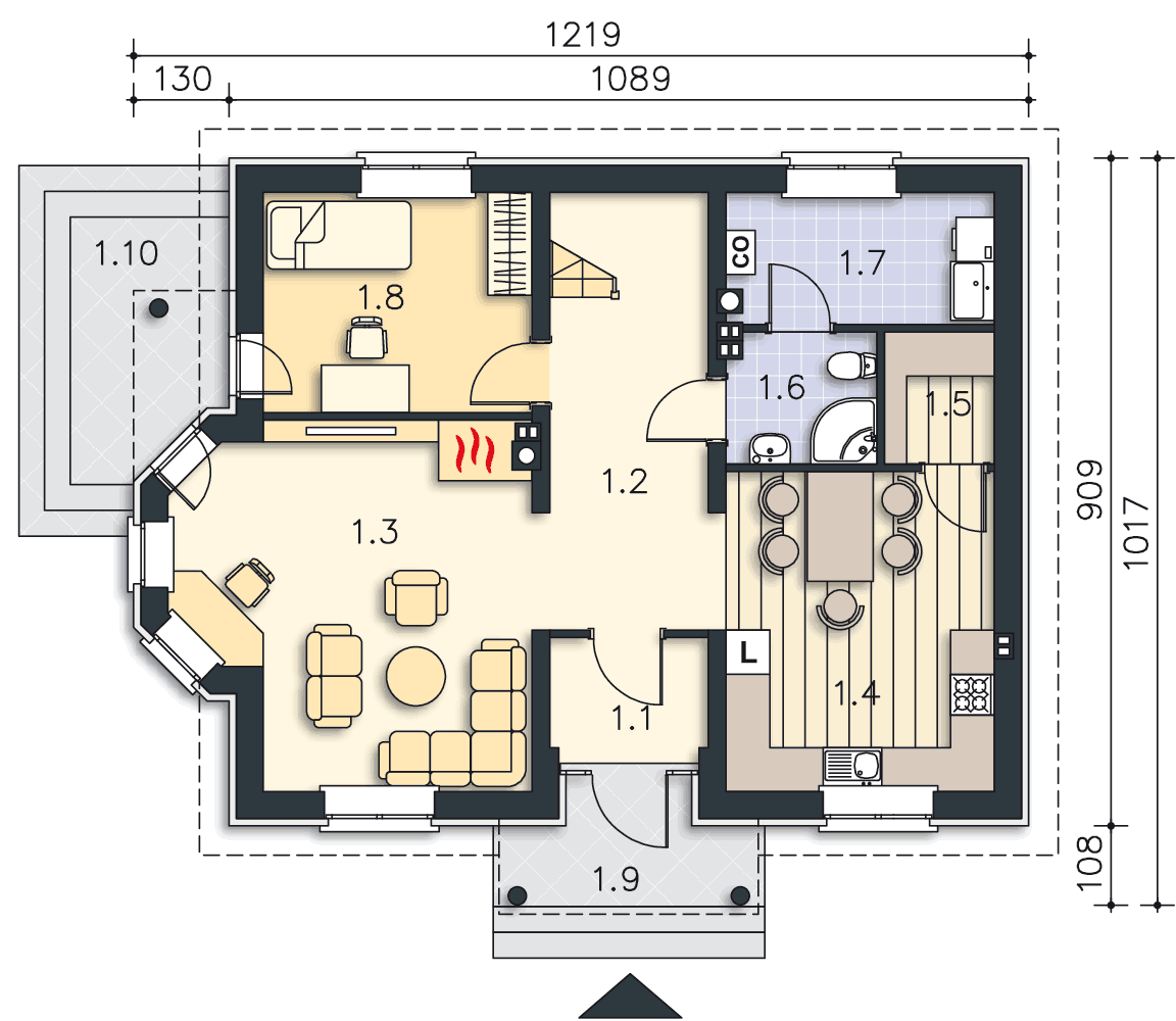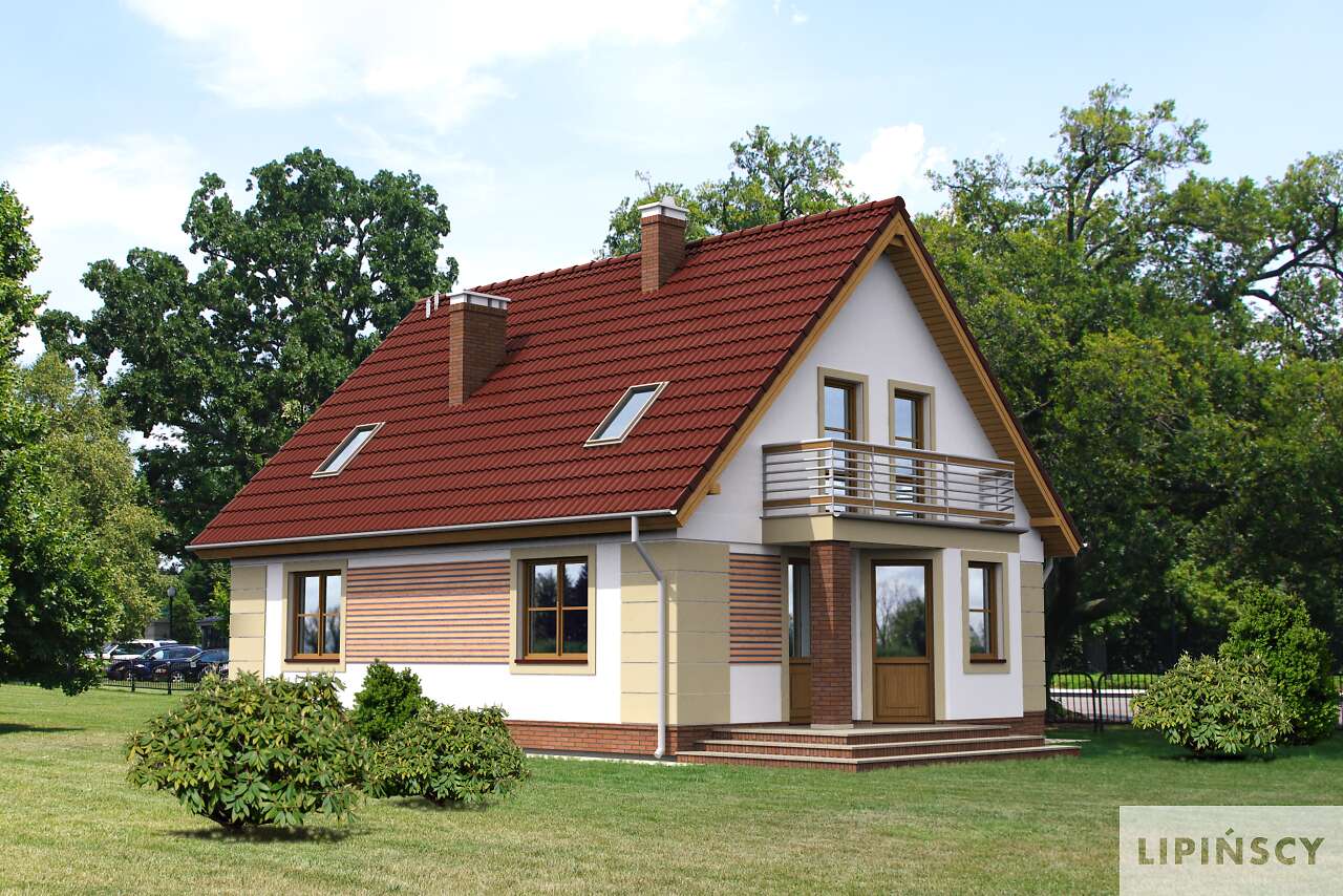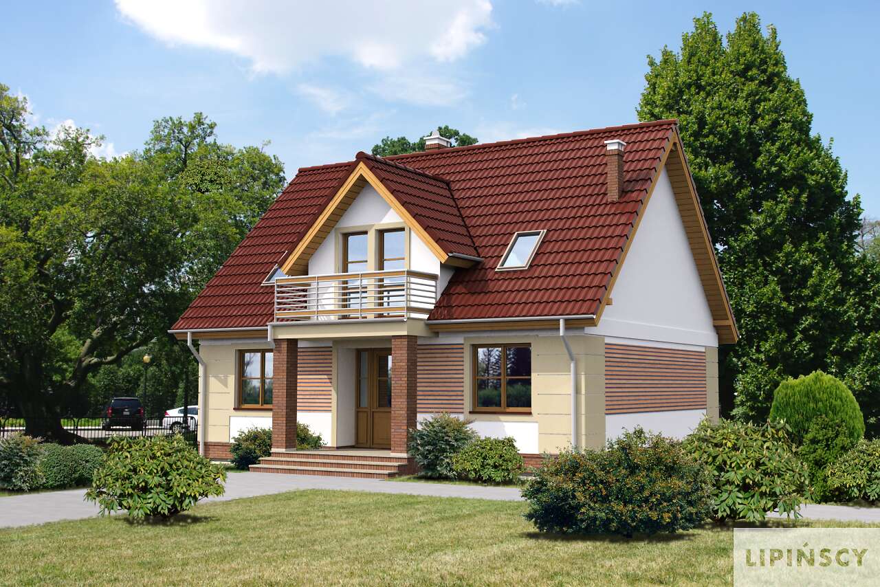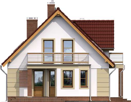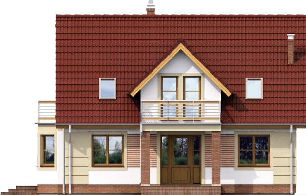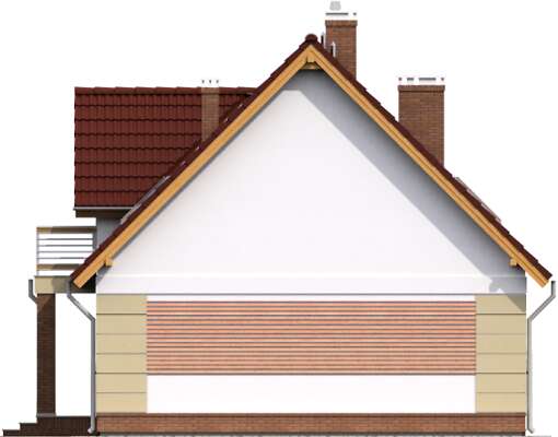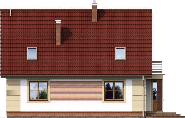 Prosty dom z użytkowym poddaszem, w którym do dyspozycji mieszkańców przewidziano wspólną część dzienną na parterze z obszerną kuchnią i salonem z wykuszem oraz część prywatną na poddaszu z trzema sypialniami i komfortową łazienką. Na parterze znajduje się także dodatkowy pokój, mogący służyć jako gabinet lub sypialnia dla gości, łazienka z wc, spiżarnia przy kuchni i pralnia z kotłem gazowym. Dzięki usytuowaniu salonu od południa, projekt sprawdzi się na działce z takim wjazdem.