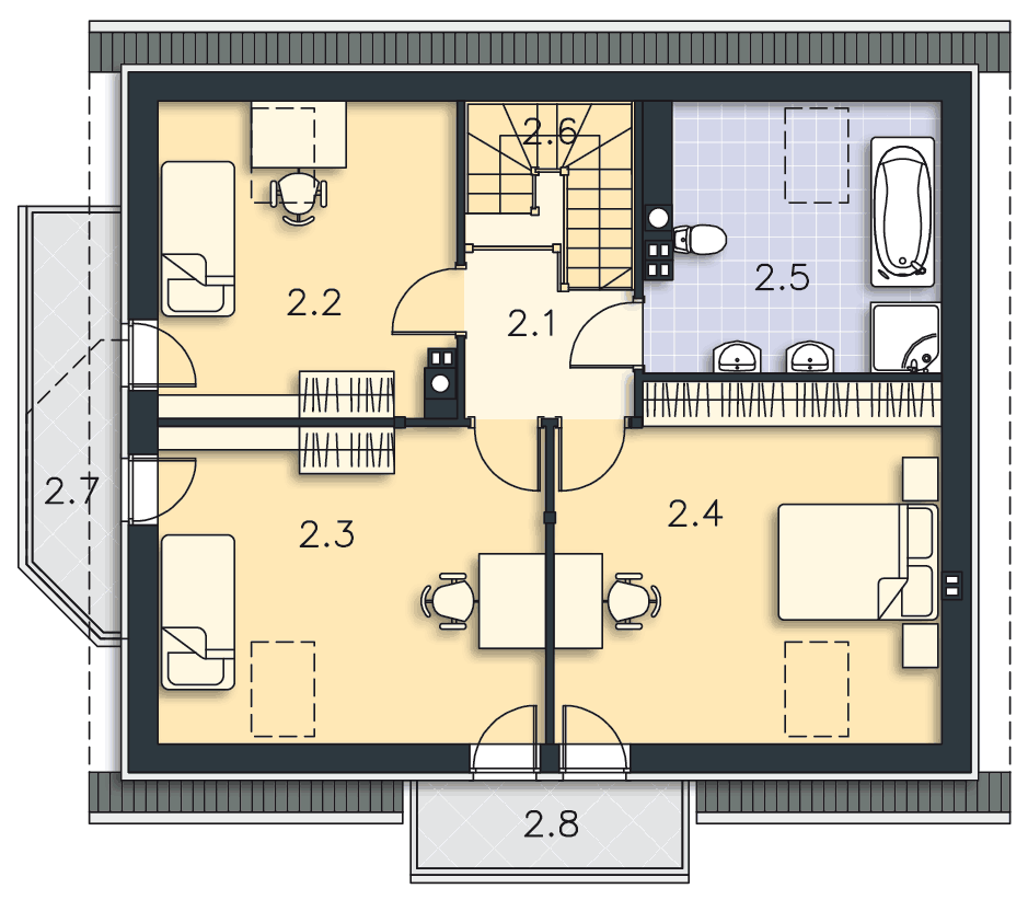 Poddasze można trochę przearanżować - np: z obecnej łazienki wykroić trochę miejsca na łazienkę dostępną z pokoju 2.4. Można zrobić podobnie, jak w projekcie Essen.