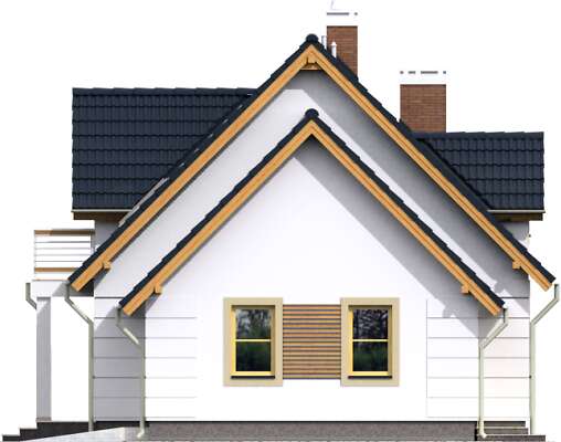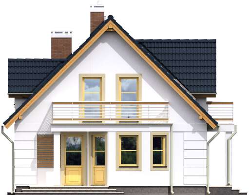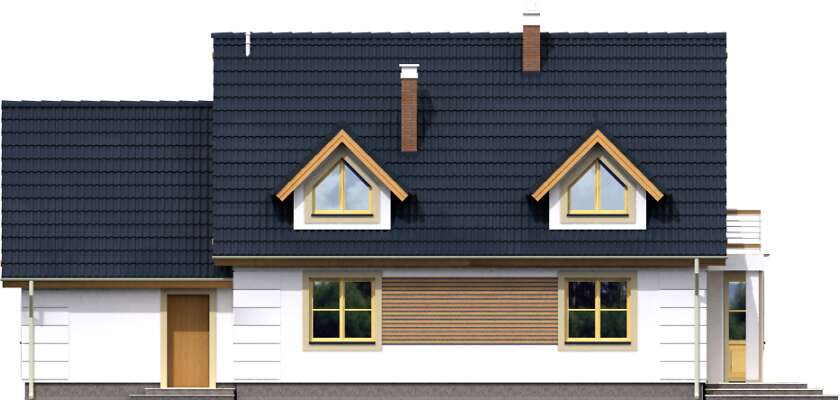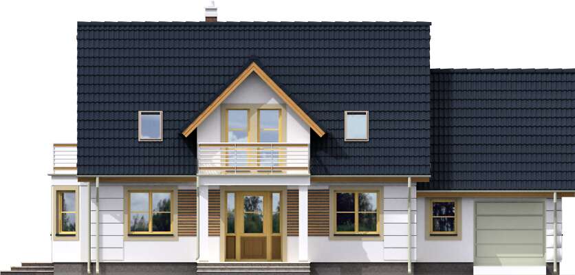 Wygodny dom z użytkowym poddaszem, nadający się na działkę z wjazdem od południa. Na parterze znajduje się pokój dzienny z kominkiem i wykuszem, duża kuchnia z miejscem na stół, dodatkowa sypialnia, spiżarnia, wc oraz kotłownia. Poddasze to trzy wygodne sypialnie i komfortowa łazienka. Do domu przynależy garaż, do którego można przejść wprost z domu. Bryła domu została wykończona jasną elewacją z drewnianymi i metalowymi barierkami.