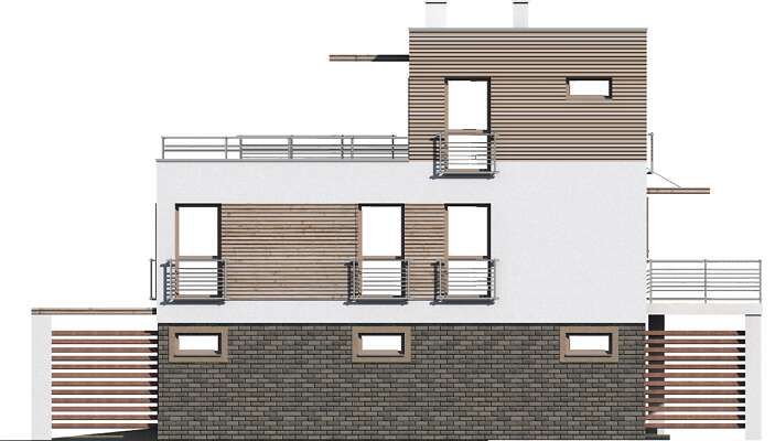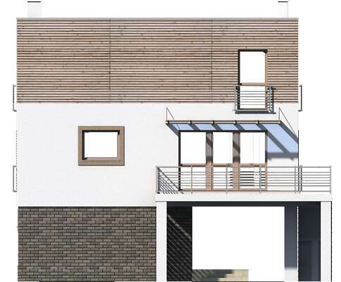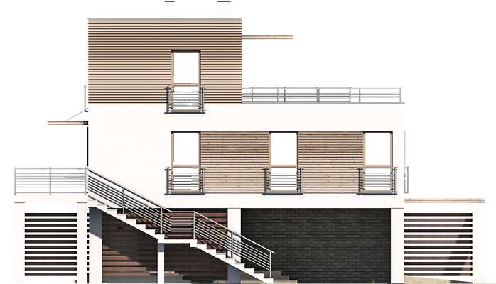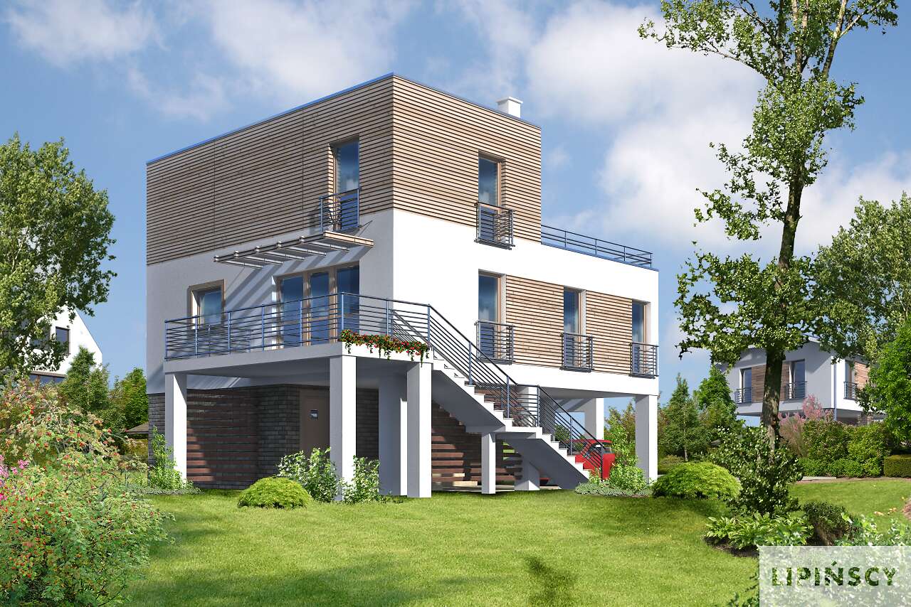 Nowoczesny dom, który zaprojektowany został z przeznaczeniem na tereny zagrożone powodzią. Minimalna powierzchnia strefy wejściowej oraz wsparta na słupach kondygnacja gwarantują mieszkańcom bezpieczeństwo i wygodę nawet przy 2,5- metrowym poziomie wody. W spójną bryłę, urozmaiconą drewnianymi elementami wkomponowany został jednostanowiskowy garaż. Na parterze znajduje się wiatrołap, kotłownia oraz pomieszczenie gospodarcze. Pierwsza kondygnacja to wyraźnie zaznaczona strefa dzienna z kuchnią, spiżarnią i dużym salonem oraz strefa prywatna z trzema sypialniami i wygodną łazienką. Druga kondygnacja doskonale sprawdzi się jako pełne przestrzeni i światła królestwo rodziców, z wygodną sypialnią, komfortową łazienką oraz garderobą.