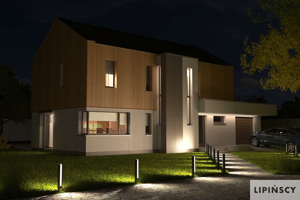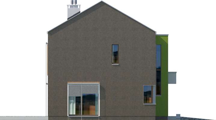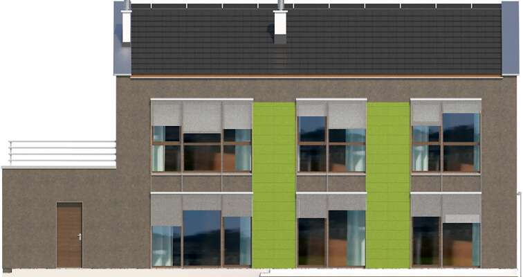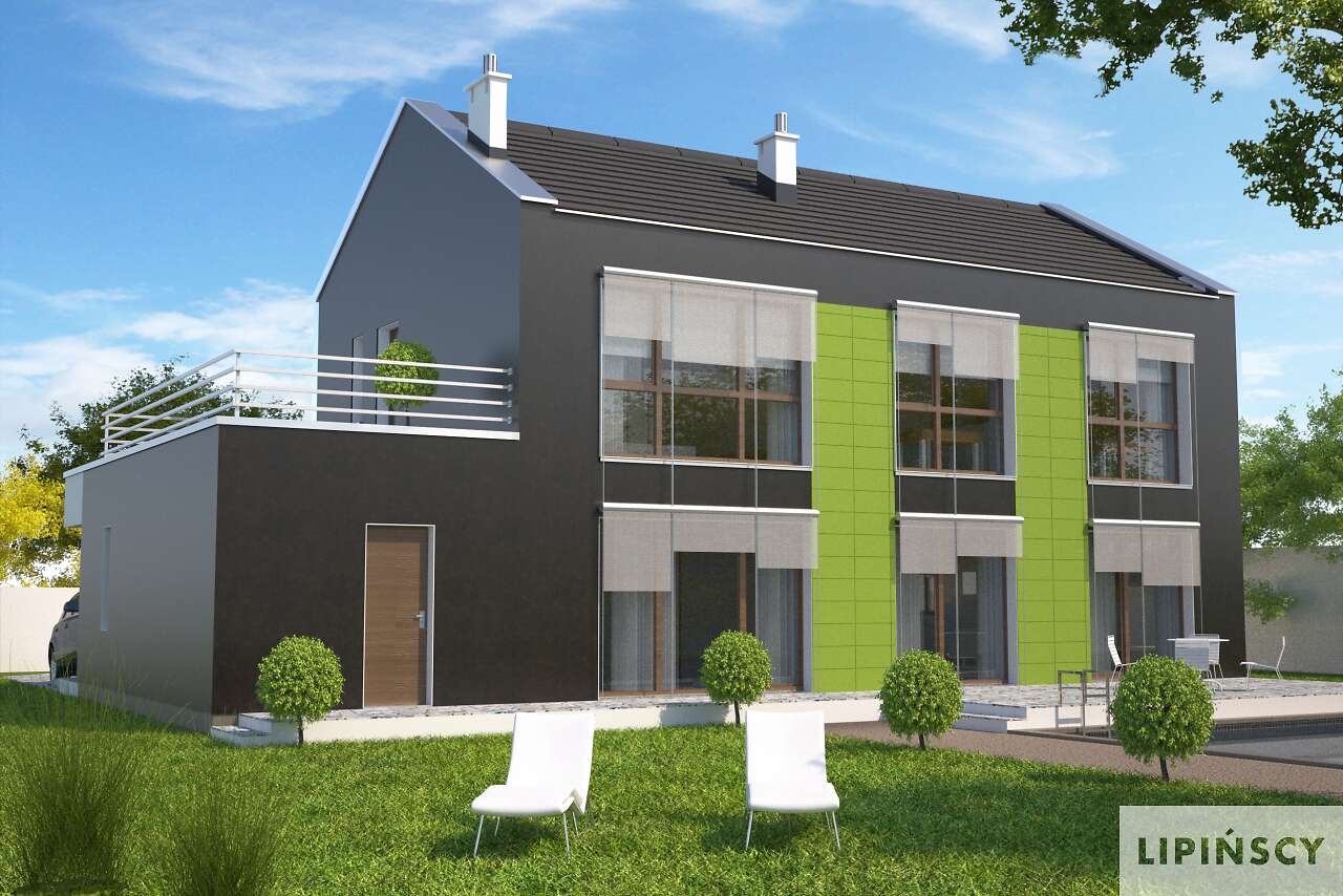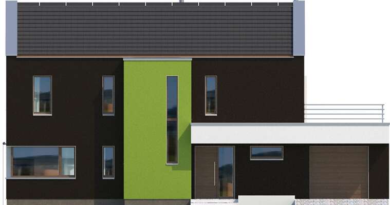 Kolejna, ciekawa odsłona projektu Santos, w którym wprowadzono dach spadzisty i przykuwającą wzrok czarną elewację, urozmaiconą zielonymi wstawkami. Wnętrza natomiast to bardzo funkcjonalny układ części dziennej, z nowoczesnym, otwartym salonem i dodatkowym pokojem, mogącym pełnić funkcję gabinetu. Na piętrze znajdują się trzy sypialnie, usytuowane od strony południowej. Największa z nich posiada osobną łazienkę i garderobą, a także wyjście na taras nad garażem. W domu znajduje się także szereg praktycznych pomieszczeń, jak pralnia spiżarnia, czy pomieszczenie techniczne za garażem. Dostępna jest również wersja projektu z podwójnym garażem, na wąska działkę.