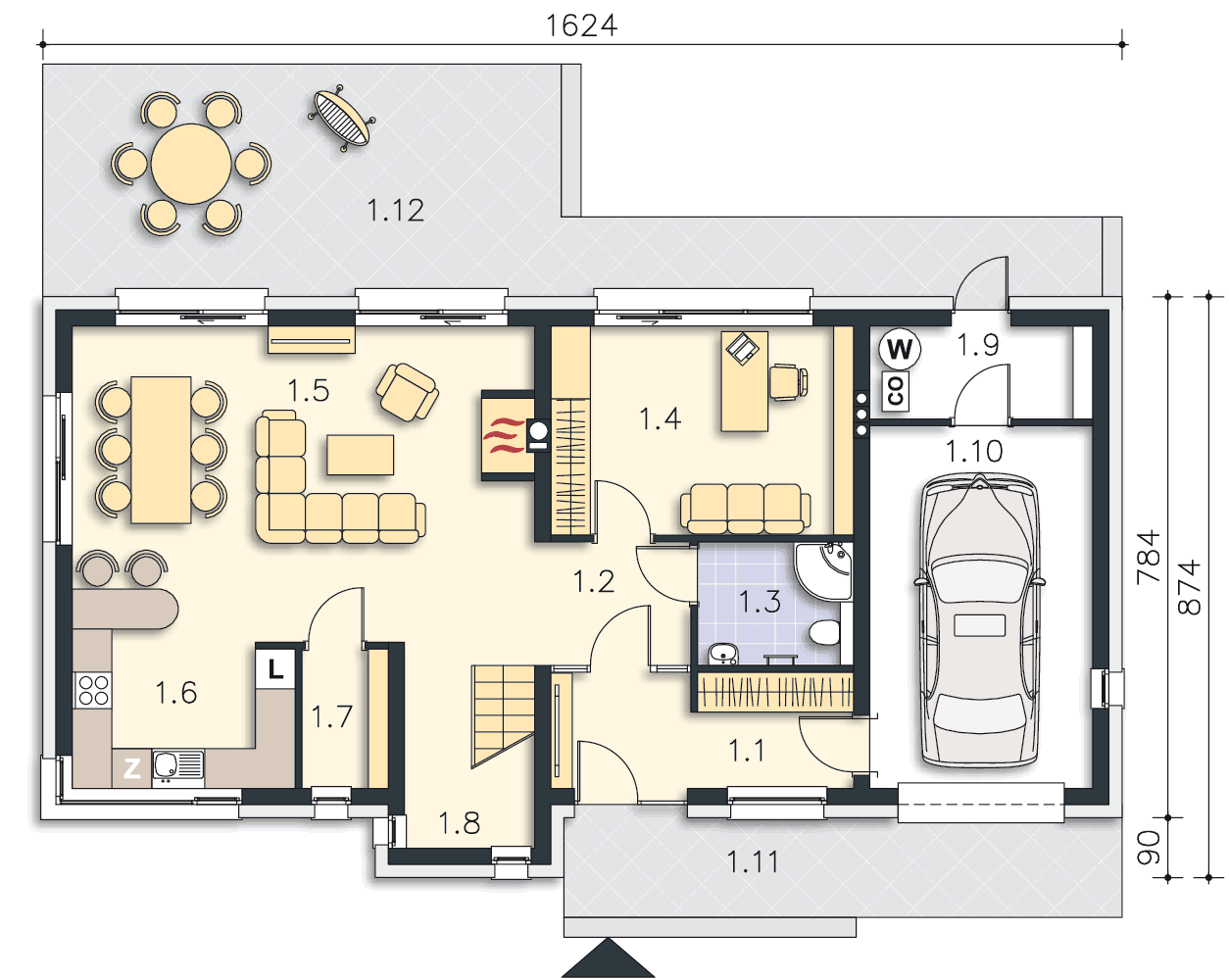 Niestety, nawet po usunięciu garażu dom nie zmieści się na działce 19m - brakuje 1,4 m. Trzeba byłoby usunąć także wszystkie okna w ścianach bocznych. Poza tym, po usunięciu garażu, trzeba będzie także usytuować piec grzewczy oraz centralę rekuperacyjną w którymś z pomieszczeń w domu, np: w części wiatrołapu 1.1.