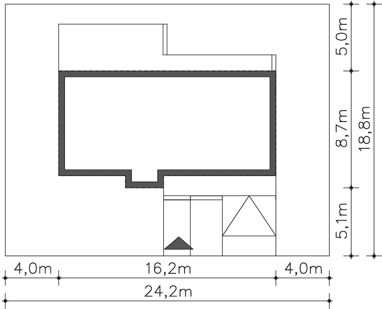Grafika przedstawia minimalne wymiary działki. Aby sprawdzić, czy dom może być realizowany na konkretnej działce należy uzyskać Wypis i Wyrys z Miejscowego Planu Zagospodarowania Przestrzennego lub jeśli na danym terenie nie ma planu – Decyzję o warunkach zabudowy. Wszystkie projekty wymagają adaptacji do warunków miejscowych przez projektanta lokalnego.