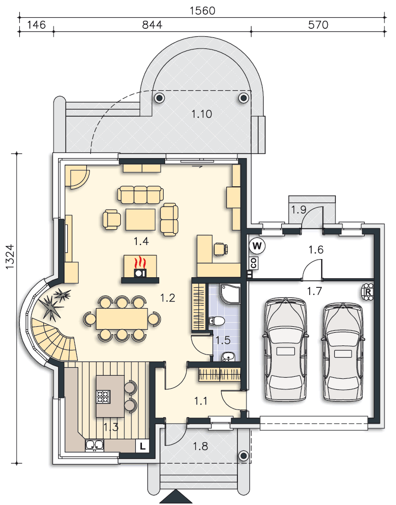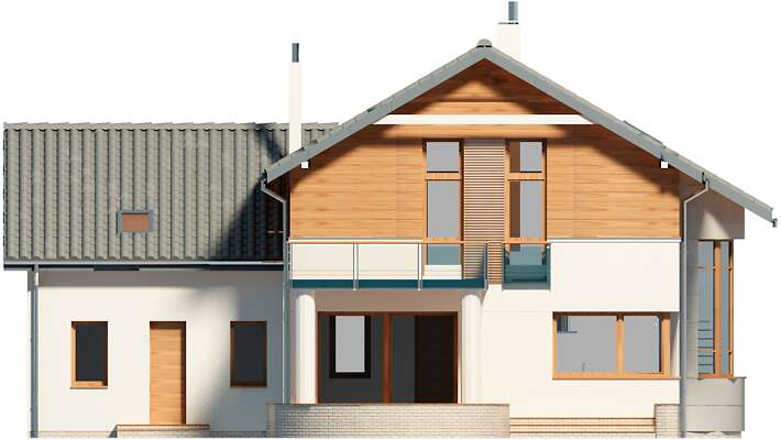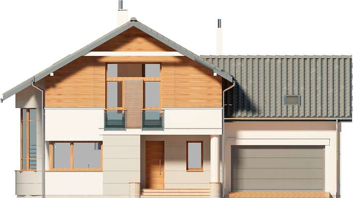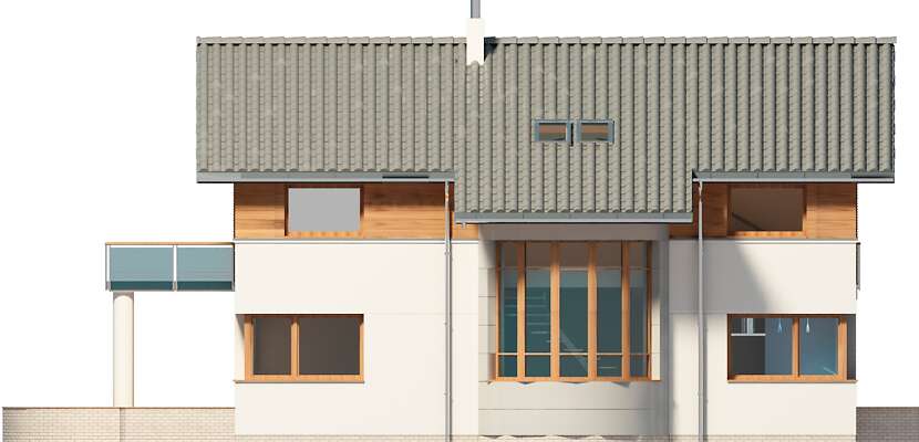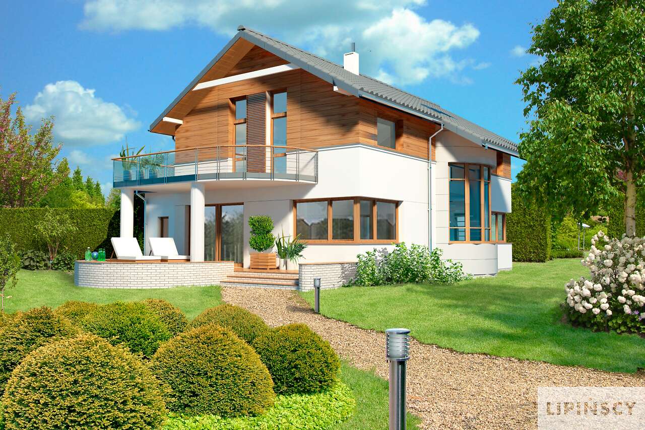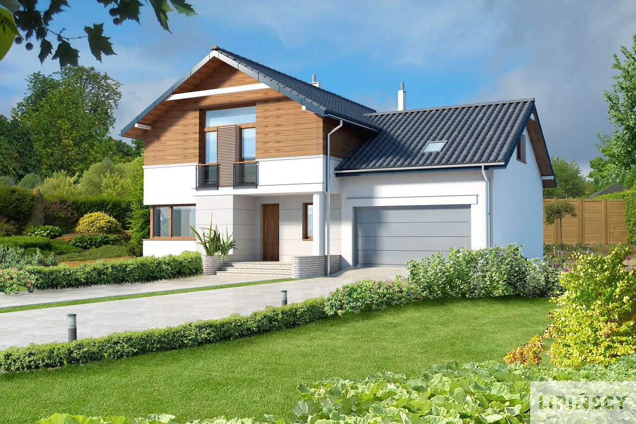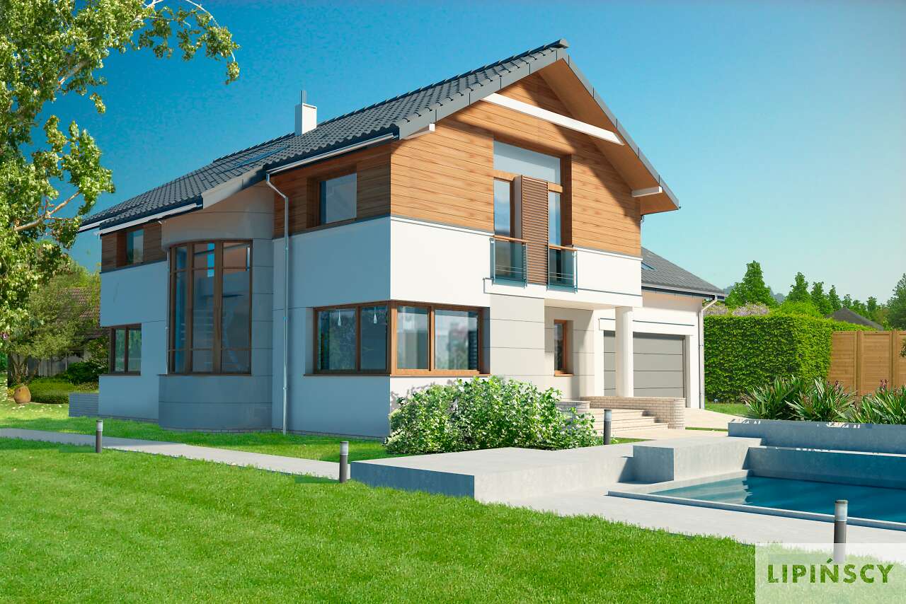 Obok tego nowoczesnego domu nie można przejść obojętnie. Przykuwa uwagę swoją bryłą, urozmaiconą łukowym wykuszem z pięknymi schodami, ciekawym detalem i starannie dobranym proporcjom. Jednak najciekawsze dzieje się we wnętrzu – wyjątkowa przestrzeń jadalni łączącej kuchnię z salonem, a jednocześnie oświetlona oknem wykusza sprawia, że jest ono niebanalne. Ciekawy taras na piętrze tworzy zadaszenie tarasu ogrodowego, na którym zmieszczą się wygodne leżaki, zachęcające do relaksu. Piętro to strefa nocna z sypialniami praktycznie bez skosów, co dla niektórych może być istotne. Warto zaznaczyć, że dom zmieści się także na stosunkowo wąskiej działce, zwłaszcza, że posiada dwustanowiskowy garaż.