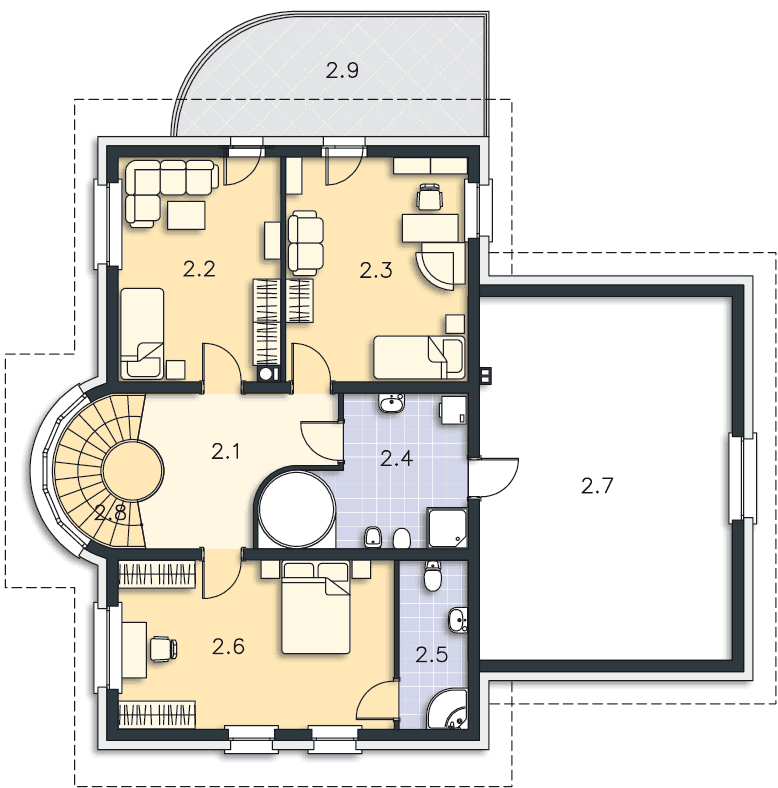 3. Chcielibyśmy podnieść dach nad 2.7 żeby uzyskać: a) dodatkową sypialnię obok 2.3 dostępną z hollu na górze obok zmniejszonej łazienki 2.4 b) pokój kąpielowy w 2.7 zamiast 2.5 dostępny z sypialni