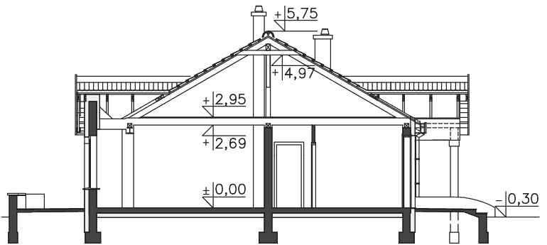 Z uwagi na to, że kąt nachylenia dachu wynosi zaledwie 30stopni, strych ma tylko wąski pas o szerokości 1,5 m, gdzie wysokość od podłogi do krokwi wynosi 190. Łączna powierzchnia tego pasa to 18 m2. Trzeba też wziąć pod uwagę, że właśnie wzdłuż kalenicy są usytuowane słupy podtrzymujące ją. Strych może służyć raczej tylko, jako pomieszczenie pomocnicze, a nie mieszkalne.