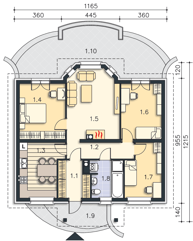 Niewielki dom parterowy, funkcjonalnie i logicznie rozplanowany. Do dyspozycji mieszkańców jest salon z dekoracyjnym wykuszem, trzy sypialnie, kuchnia i łazienka. Duży taras, usytuowany od strony ogrodu, pozwala na rodzinne spotkania na świeżym powietrzu. Niewielkie rozmiary budynku pozwalają na usytuowanie go na małej działce. Uwagę zwraca także prosta, ale ciekawa bryła, dzięki czemu dom można wybudować tanim kosztem.