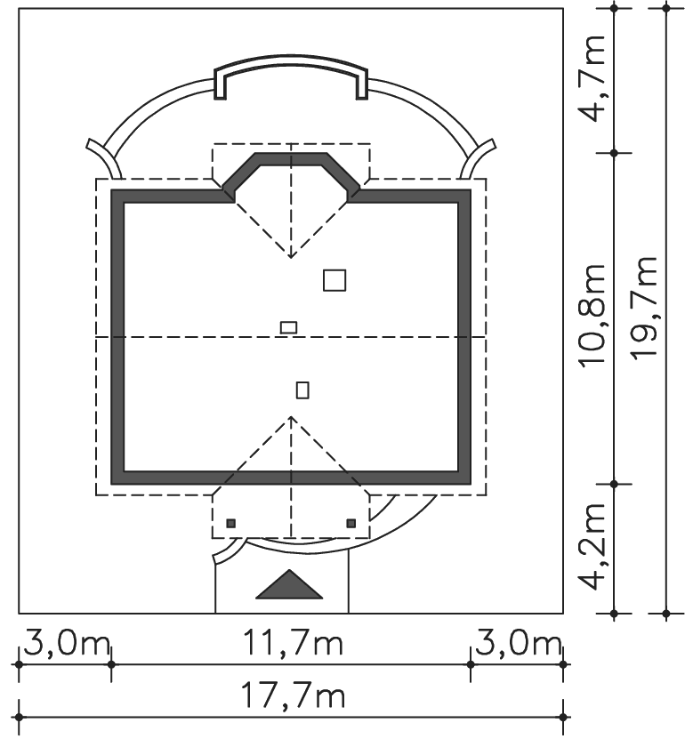 Grafika przedstawia minimalne wymiary działki. Aby sprawdzić, czy dom może być realizowany na konkretnej działce należy uzyskać Wypis i Wyrys z Miejscowego Planu Zagospodarowania Przestrzennego lub jeśli na danym terenie nie ma planu – Decyzję o warunkach zabudowy. Wszystkie projekty wymagają adaptacji do warunków miejscowych przez projektanta lokalnego.