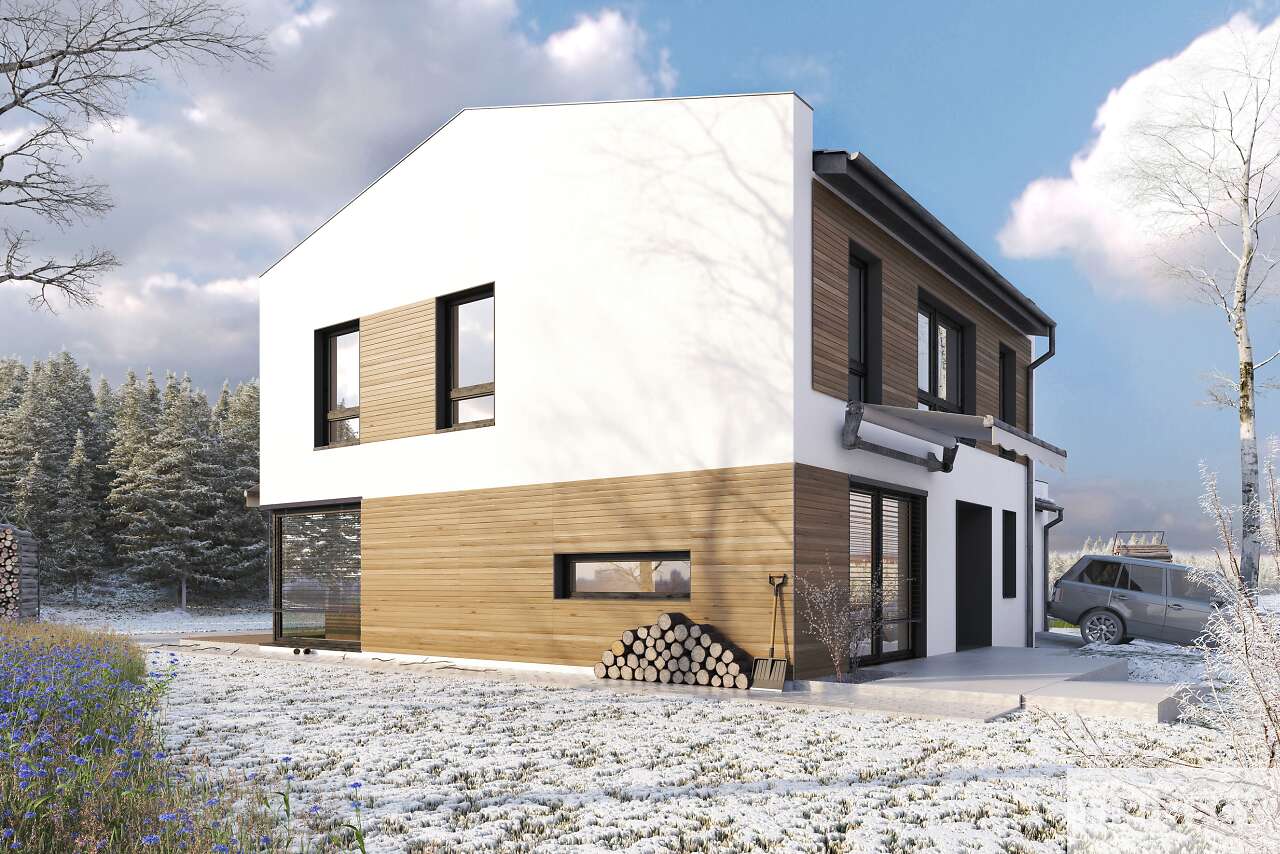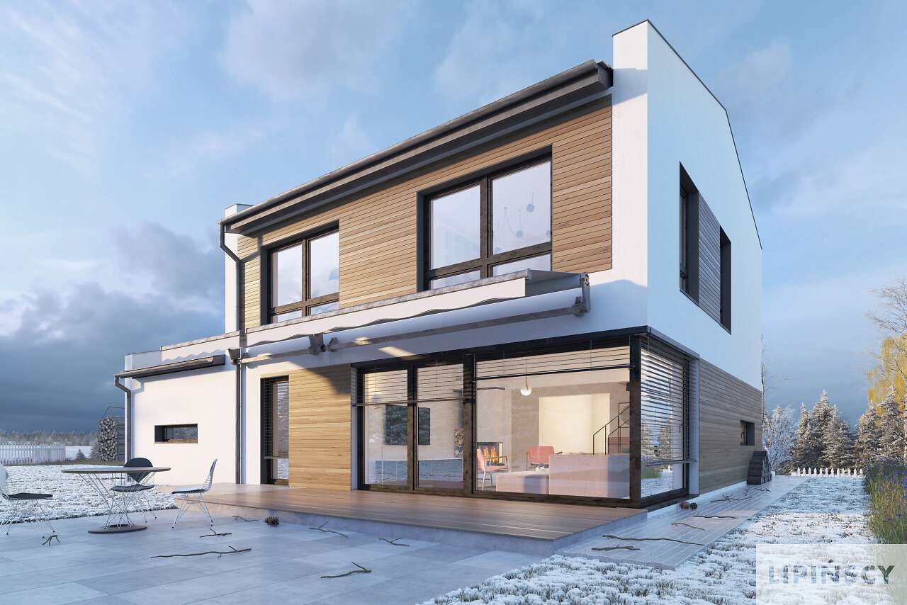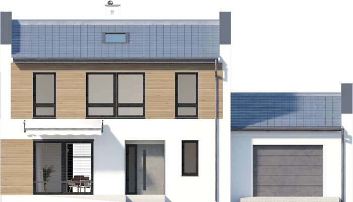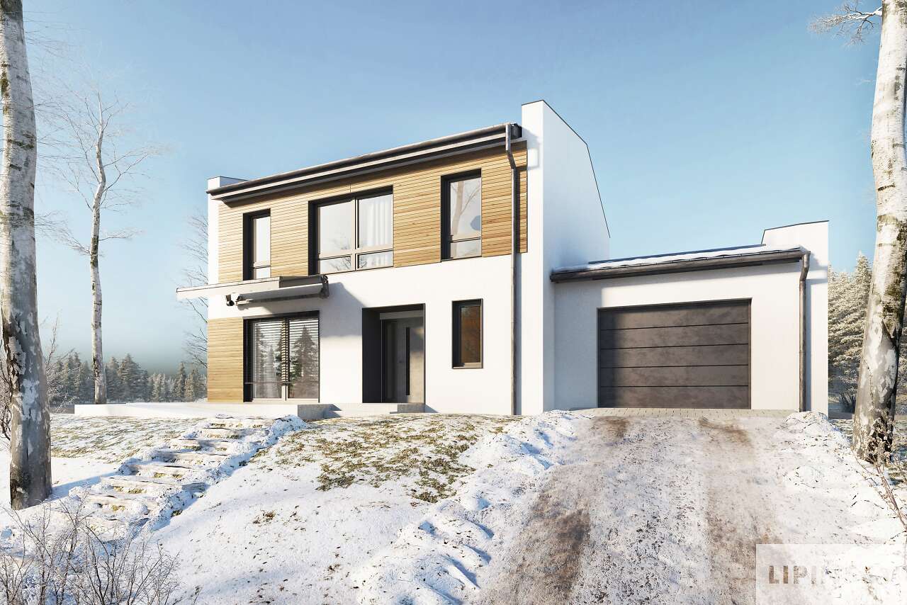 Kolejna odsłona pięknego domu energooszczędnego z użytkowym poddaszem, zaprojektowanego na planie kwadratu, co umożliwia bardzo funkcjonalne rozplanowanie przestrzeni. Na parterze znajduje się duża kuchnia z miejscem na rodzinny stół. Sercem domu jest wygodny salon z wyjściem a taras, który dzięki dużym przeszklonym oknom staje się jego przedłużeniem. Jest tu także gabinet – doskonałe rozwiązanie dla osób pracujących w domu oraz łazienka i pomieszczenie gospodarcze. Drugą kondygnację zajmują trzy sypialnie, w tym jedna z dużą, niezależną łazienką i garderobą. W bryłę domu wpisano garaż na jedno auto, a budynek urzeka harmonią, jest prosty i równocześnie elegancki.