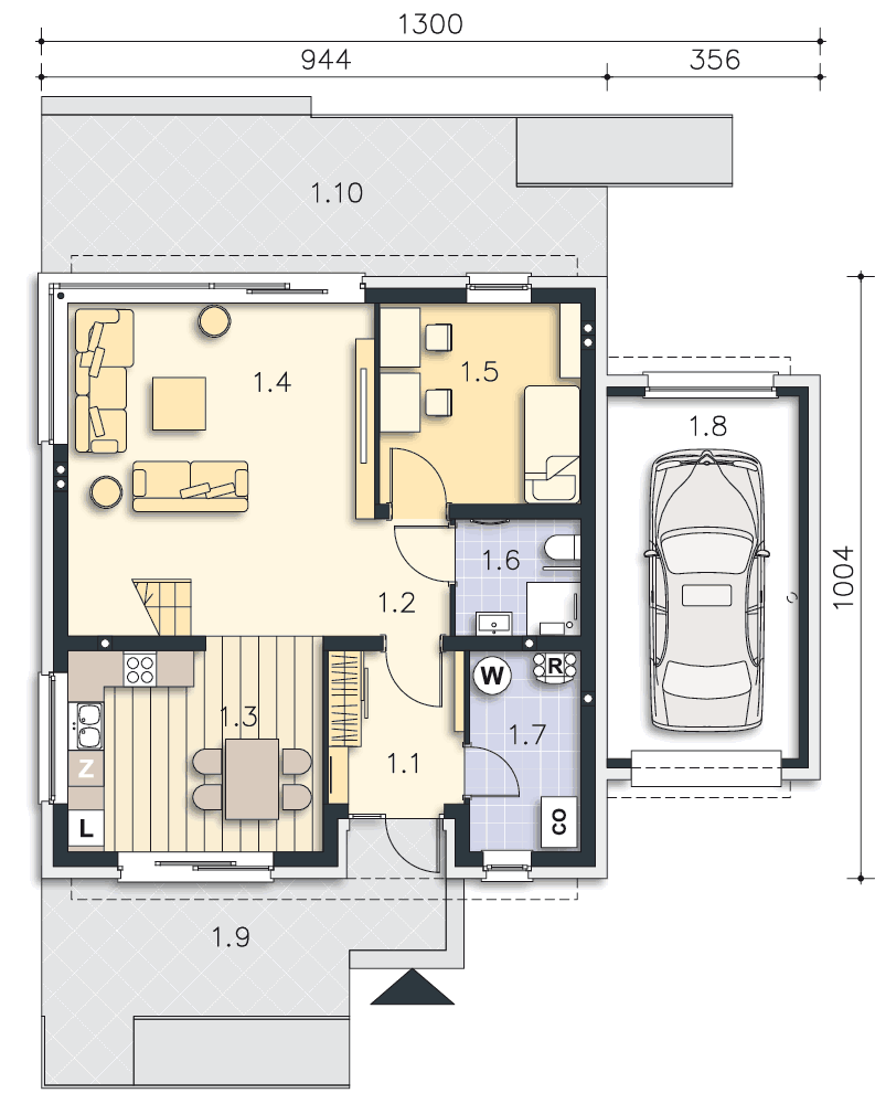 Optymalne usytuowanie to wjazd od wschodu. Wówczas salon doświetlony jest od strony południowej i zachodniej. Można zastosować dach płaski, a parametry zmienią się nieznacznie.