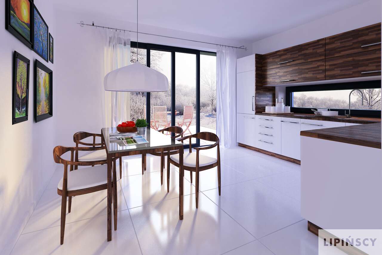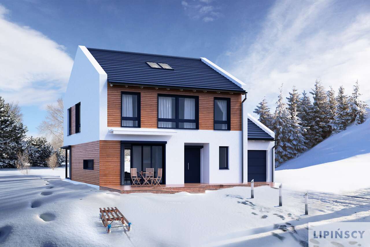 Malowniczy dom, będący spełnieniem marzeń o własnych czterech kątach. Energooszczędny, piętrowy, funkcjonalny, idealny dla czteroosobowej rodziny. Przestronna kuchnia z własnym tarasem jest świetnym miejscem do rodzinnych posiłków. W części dziennej na parterze mamy duży salon otwarty na ogród z narożnymi oknami i tarasem, gabinet oraz łazienkę. Część gospodarcza to garaż oraz kotłownia. Na piętrze znajduje się duża sypialnia rodziców z własną łazienką i obszerną garderobą, a także dwa jasne pokoje dla dzieci i łazienka. Do dyspozycji mieszkańców jest również strych.