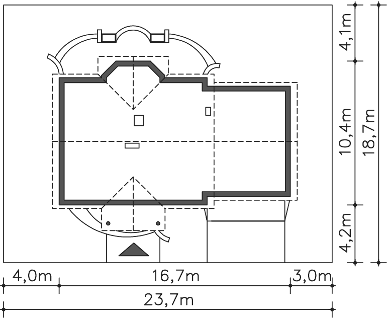 Grafika przedstawia minimalne wymiary działki. Aby sprawdzić, czy dom może być realizowany na konkretnej działce należy uzyskać Wypis i Wyrys z Miejscowego Planu Zagospodarowania Przestrzennego lub jeśli na danym terenie nie ma planu – Decyzję o warunkach zabudowy. Wszystkie projekty wymagają adaptacji do warunków miejscowych przez projektanta lokalnego.