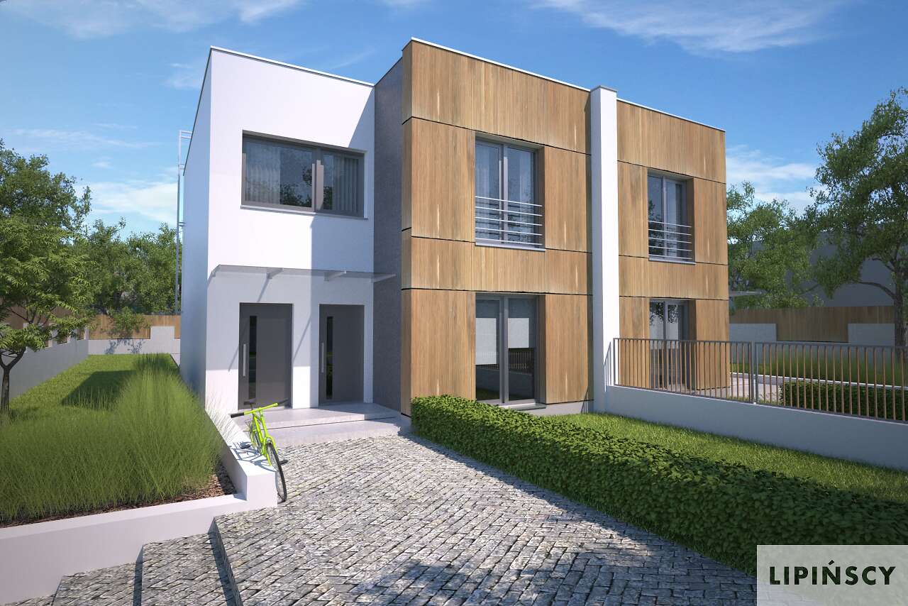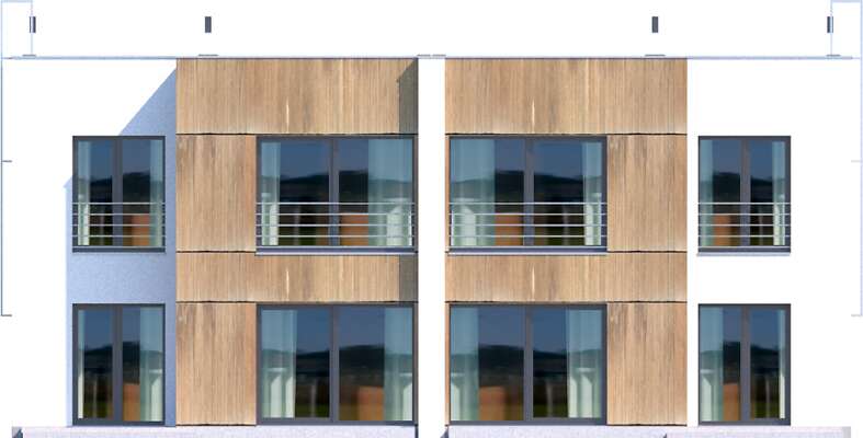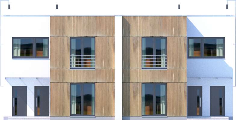 Nowoczesny dom energooszczędny, z płaskim dachem, z możliwością budowy jako dom w zabudowie bliźniaczej, szeregowej lub pojedynczy segment. W każdym z segmentów wyodrębniono dwa mieszkania, z niezależnym wejściem z klatki schodowej. Na parterze znajduje się część wspólna, czyli salon z aneksem kuchennym. Zaprojektowano tu także dwie sypialnie, wygodną łazienkę i pomieszczenie gospodarcze (kotłownia z pralnią). Na drugiej kondygnacji mieści się podobne mieszkanie, powiększone o niewielki gabinet. Nowoczesna i elegancka bryła przypadnie do gustu inwestorom ceniącym proste i funkcjonalne domy, w których każdy metr powierzchni zaplanowany został z myślą o wygodzie mieszkańców.