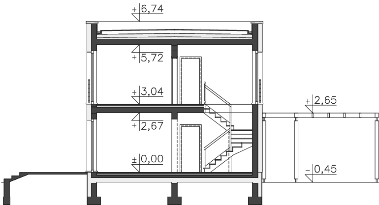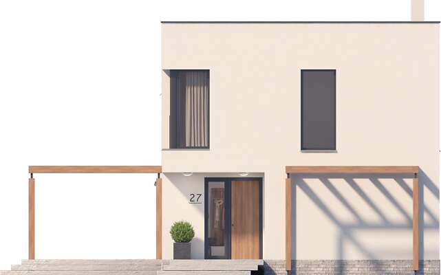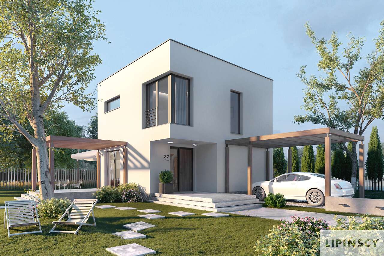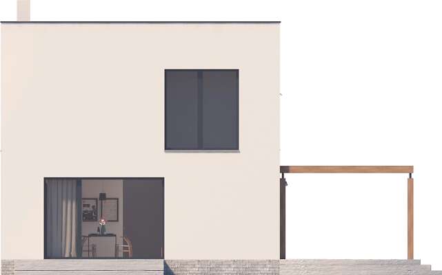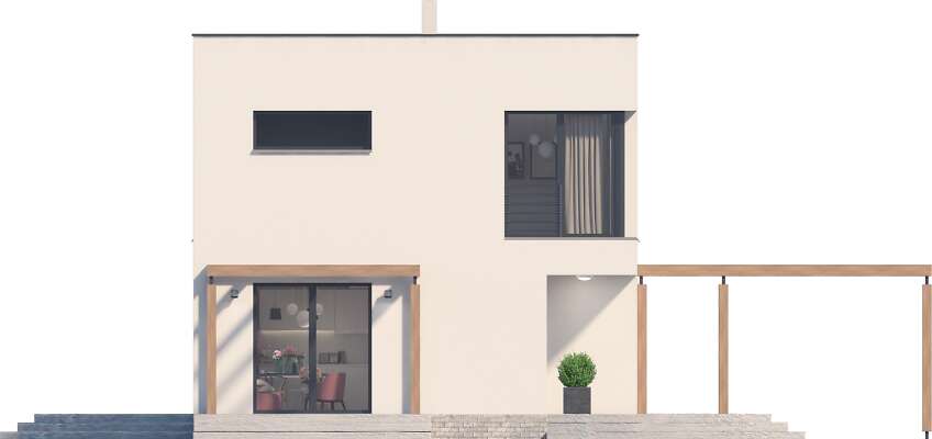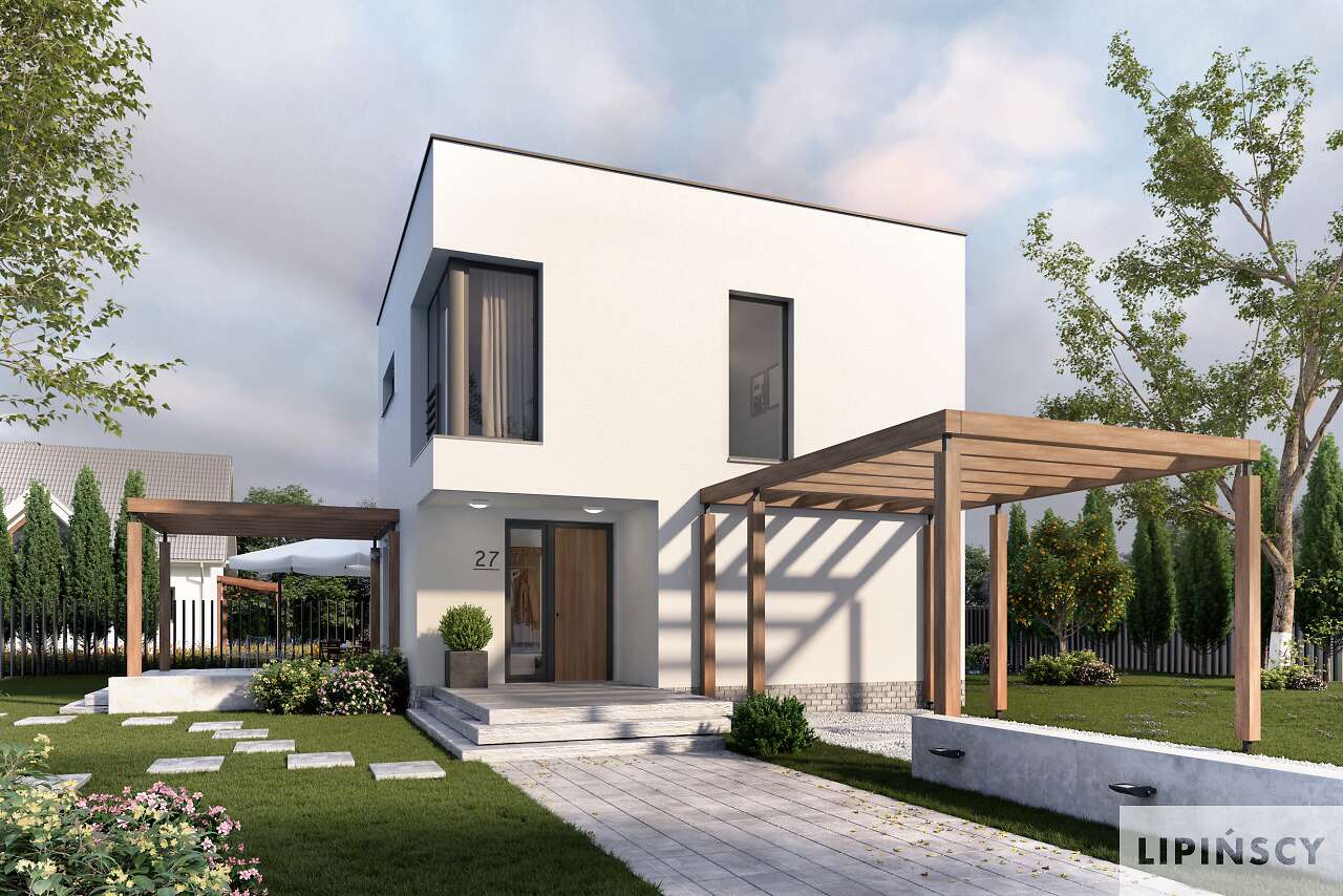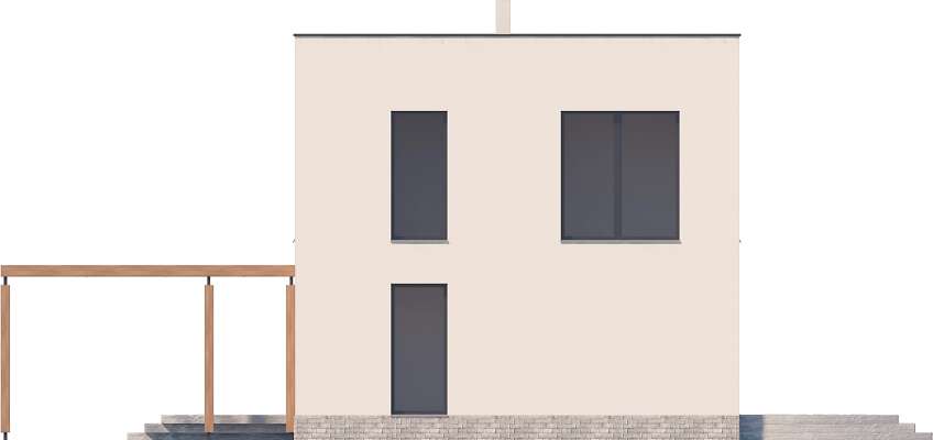 Nieduży, energooszczędny dom z płaskim dachem, o dwóch kondygnacjach, zwartej bryle i nowoczesnym wyglądzie. Niewielki metraż i funkcjonalnie rozplanowane wnętrze to idealna propozycja pierwszego domu dla niedużej rodziny lub pary – domu na życiowy start. Na parterze znajduje się salon z aneksem kuchennym i częścią jadalnianą, toaleta oraz pralnia, w której umieszczono kocioł gazowy. Druga kondygnacja, to strefa prywatna. Zlokalizowano w niej trzy ustawne sypialnie oraz wygodną łazienkę. Prosta bryła i architektura budynku sprawia, że jest on niedrogi w realizacji i późniejszej eksploatacji. W projekcie przewidziano ogrzewanie kotłem na gaz. Możliwa jest zmiana ogrzewania na pompę ciepła.