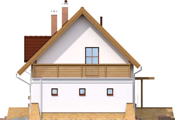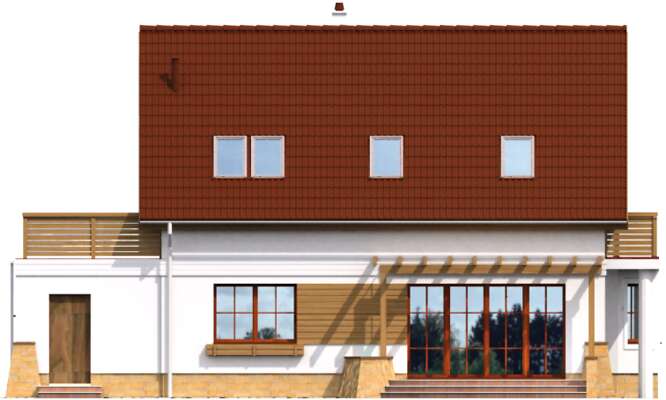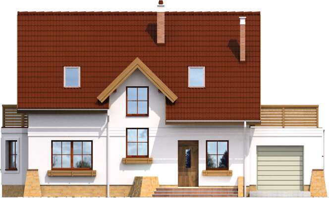 Energooszczędny dom z użytkowym poddaszem o tradycyjnej bryle, która będzie się dobrze komponować na działkach wiejskich i podmiejskich. Jest to nieco zmieniona wersja projektu DCP240a, w którym doprojektowano wykusz w salonie. Na parterze znajduje się duży pokój dzienny z kominkiem i miejscem na rodzinny stół, kuchnia, spiżarnia, dodatkowa sypialnia, łazienka oraz pomieszczenie gospodarcze z przejściem do garażu. Na poddaszu, w części nocnej przewidziano trzy sypialnię i wygodną łazienkę. Ozdobą domu są dwa tarasy, jeden zlokalizowany na dachu garażu, drugi, z pergolą – od strony ogrodowej.