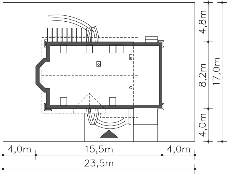 Grafika przedstawia minimalne wymiary działki. Aby sprawdzić, czy dom może być realizowany na konkretnej działce należy uzyskać Wypis i Wyrys z Miejscowego Planu Zagospodarowania Przestrzennego lub jeśli na danym terenie nie ma planu – Decyzję o warunkach zabudowy. Wszystkie projekty wymagają adaptacji do warunków miejscowych przez projektanta lokalnego.