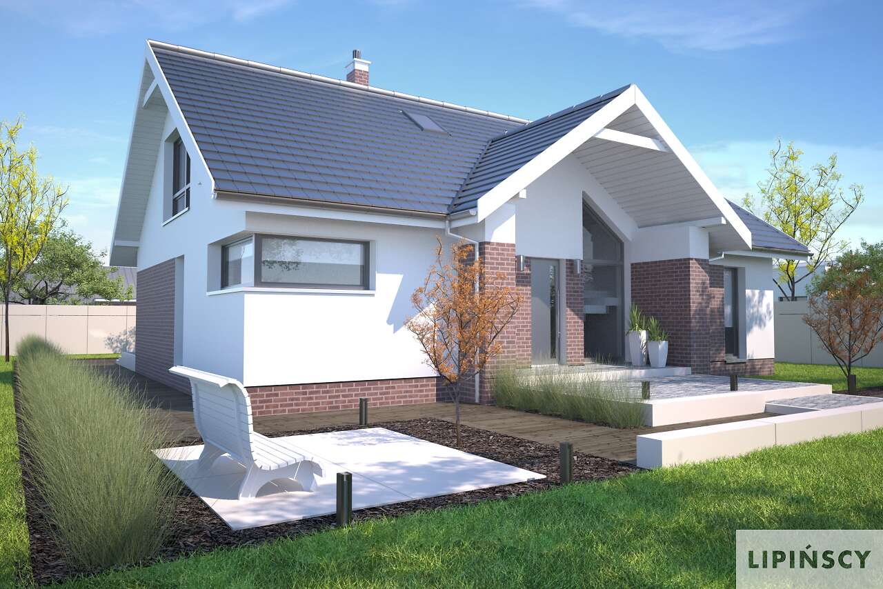 Ładny, symetryczny projekt domu, z bardzo dokładnie przemyślanym wnętrzem. Na parterze znajduje się wydzielona część z dużą sypialnią, garderobą i łazienką, która tworzy apartament dla rodziców. Natomiast dwie sypialnie dla dzieci znajdują się na poddaszu. Salon doświetlony jest dużym przeszkleniem, otwierającym dom na ogród. Kuchnia połączona jest z jadalnią w jedną dużą przestrzeń i dodatkowo wyposażona w praktyczne pomieszczenie gospodarcze. W tym domu na szczególną uwagę zwracają także okna – od frontu schody ozdabia ukośne przeszklenie, łazienka na parterze ma okno narożne, w kuchni i jadalni zastosowano nowoczesne okno panoramiczne. Wnętrza w takim domu na pewno będą dawały wiele możliwości aranżacji wręcz żurnalowych. Dostępna jest również wersja projektu z kątem nachylenia dachu 45 stopni.