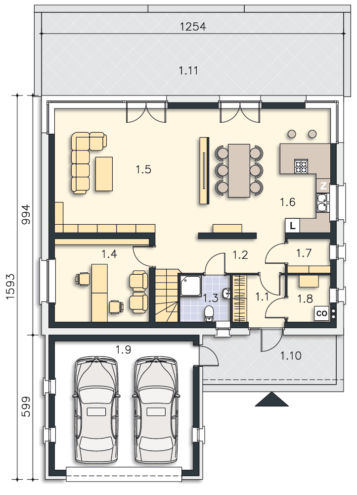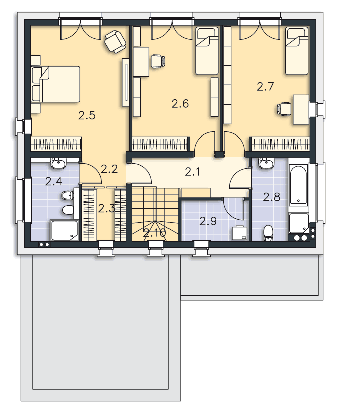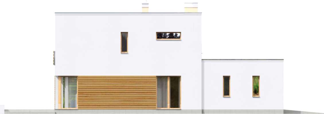 Przestronny piętrowy dom pasywny z dwustanowiskowym garażem to propozycja na stosunkowo wąskie działki, usytuowane wjazdem od północy. Układ pomieszczeń pozwala na maksymalne wykorzystanie przestrzeni, dzięki czemu np.: sypialnie na poddaszu są naprawdę duże i nie brakuje tu tak potrzebnych pomieszczeń, jak pralnia, osobna łazienka i garderoba dla rodziców, czy dodatkowy gabinet na parterze.