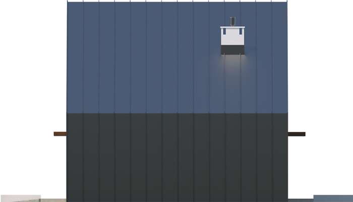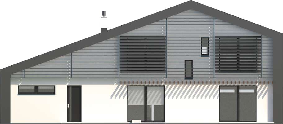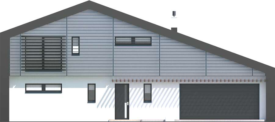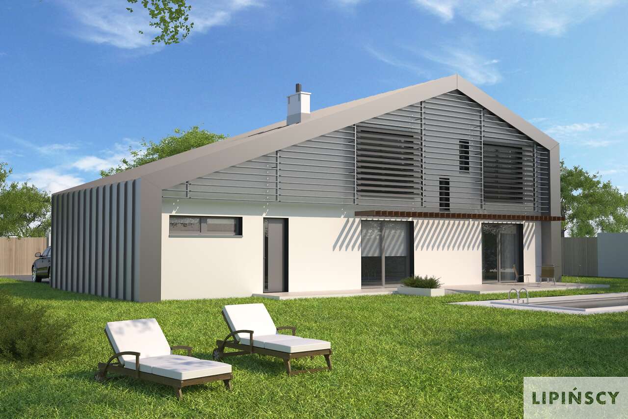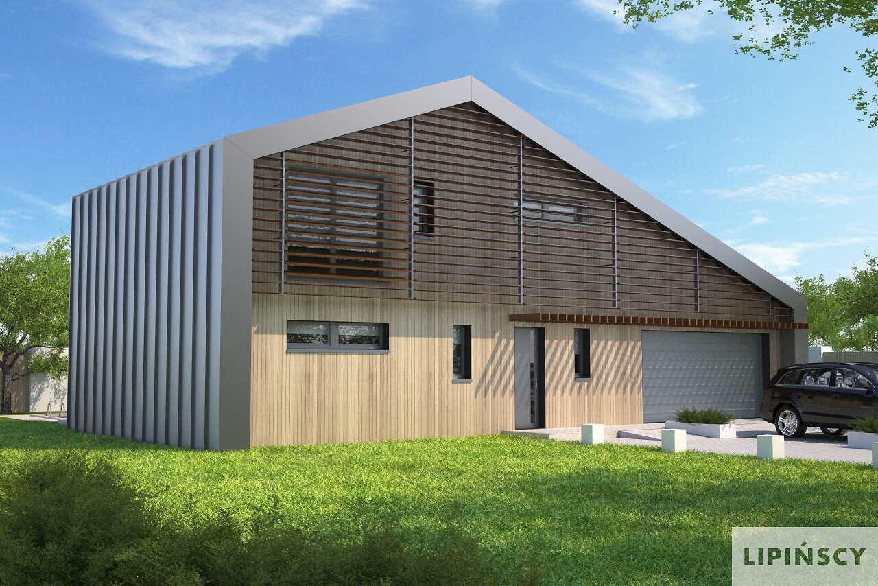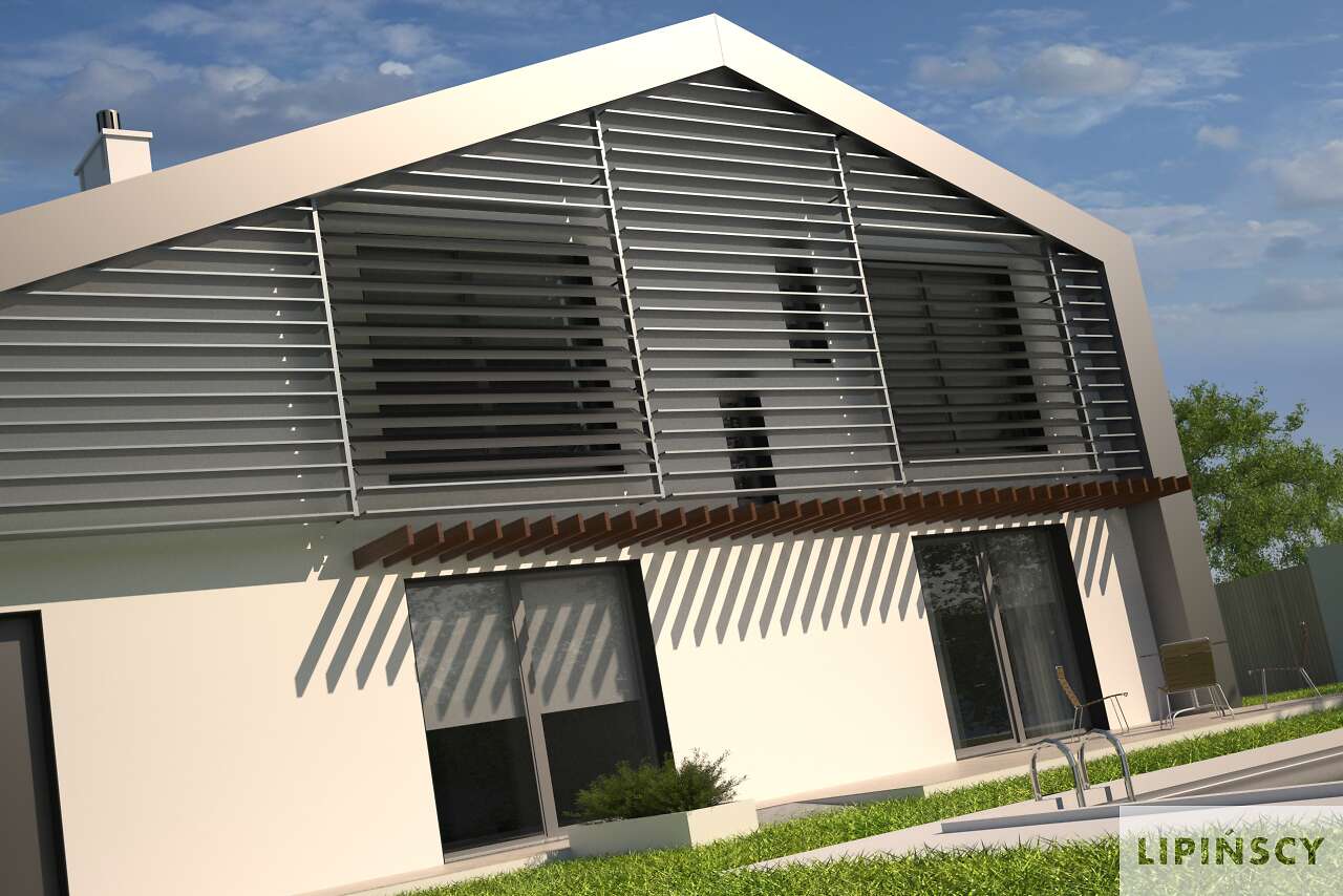Mocna bryła tego energooszczędnego domu już z daleka przyciąga wzrok. Niestandardowe potraktowanie dachu i ścian, jako osłony domu jest uzasadnione funkcjonalnie i energooszczędnie. Ponadto zapewnia ciągłość izolacji bez mostków termicznych. Wnętrze domu natomiast to czytelny układ pomieszczeń z przestronną strefą dzienną i dodatkowym pokojem dostosowanym do potrzeb osoby niepełnosprawnej. Część techniczna została wydzielona z domu i umieszczona w strefie zadaszenia nad garażem. Do garażu można przejść bezpośrednio z domu. Charakterystycznym elementem domu są także fasadowe żaluzje wielkogabarytowe, z możliwością regulacji kąta nachylenia paneli przy oknach. Ich rysunek jest mocno widoczny na elewacji i nadaje domu nowoczesnego charakteru. W domu zastosowano także szereg elementów znacznie obniżających zapotrzebowanie na energię do ogrzewania, zatem projekt uzyskał znakomity wynik, kwalifikujący ten dom do programu dopłat NFOŚiGW.