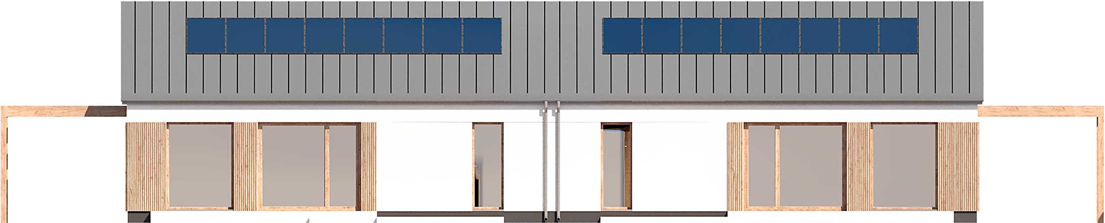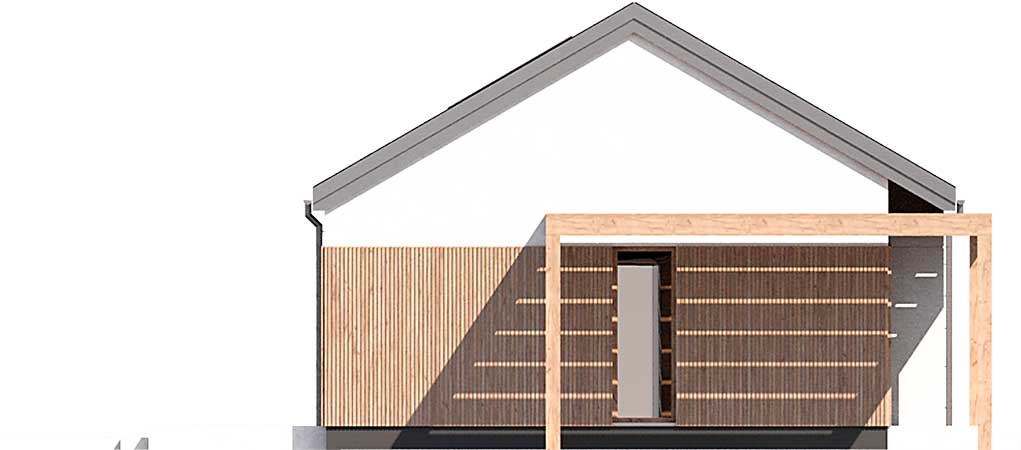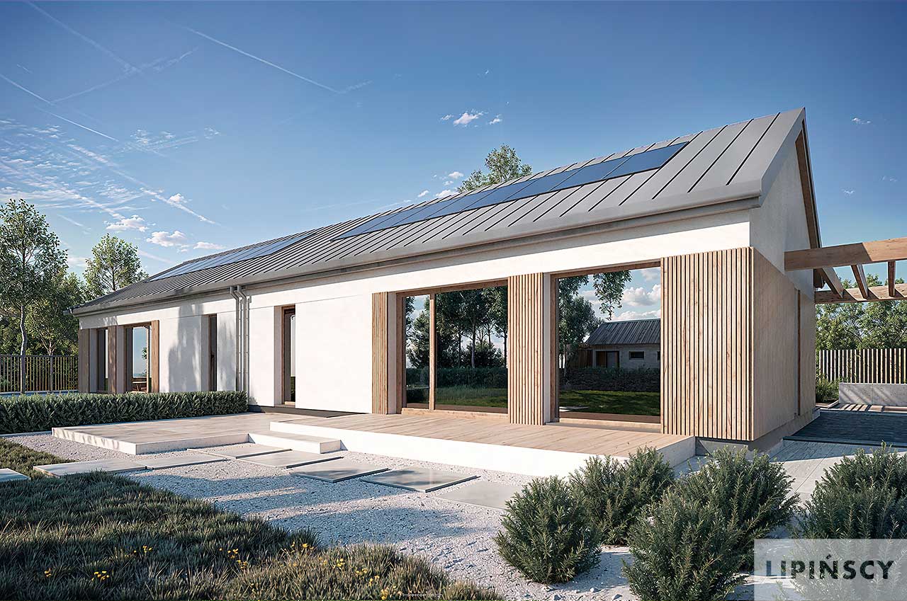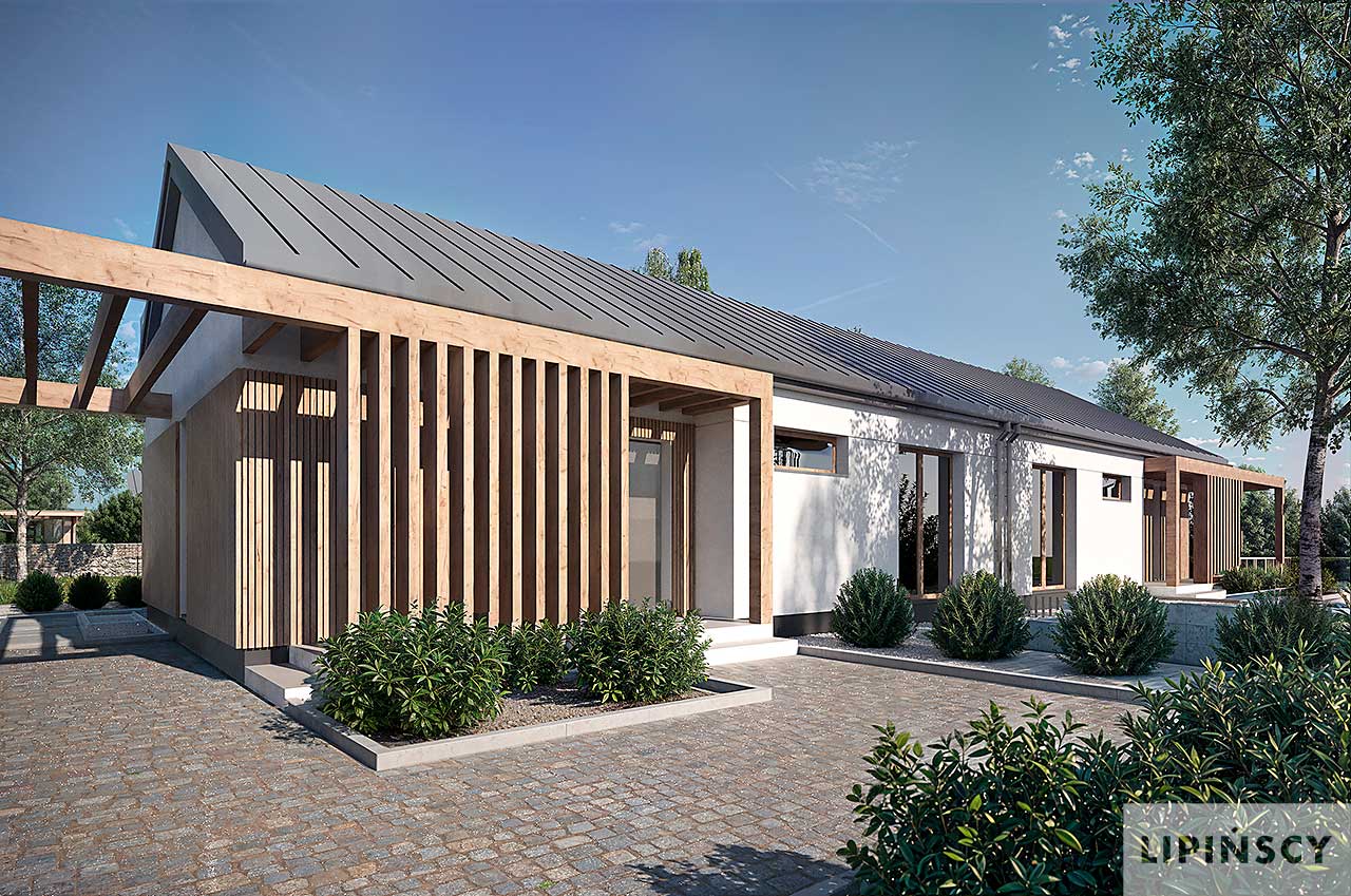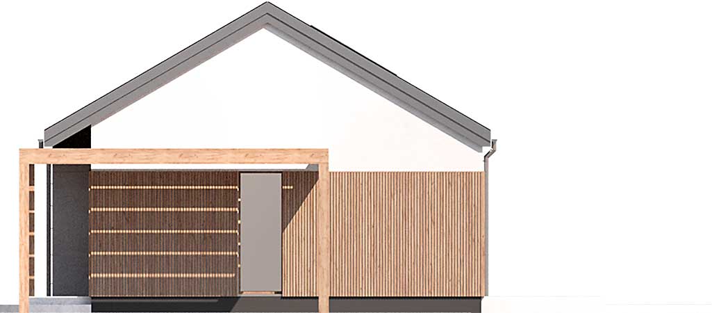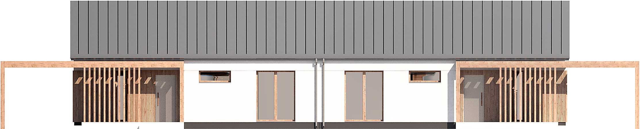 Tenna II to projekt parterowego domu w zabudowie bliźniaczej z ozdobną, ale i praktyczną pergolą przy wejściu. Dom jest energooszczędny, a instalacje pompy ciepła i rekuperacji zostały umieszczone w pomieszczeniu technicznym przy wejściu. Powierzchnie pomieszczeń zostały optymalnie dobrane tak, aby były komfortowe, ale nie powiększały zanadto powierzchni użytkowej. Salon połączony z kuchnią ma spore przeszklenia wychodzące na ogród, dzięki czemu cała strefa dzienna jest doskonale doświetlona i wydaje się bardziej przestronna. W obu sypialniach również przewidziano okna tarasowe, które lepiej doświetlają wnętrza. Dostępna jest jedna duża i widna łazienka z wysokim oknem od frontu. Dzięki prostej bryle z dwuspadowym dachem dom jest tani w budowie i eksploatacji. Dom Tenna II jest świetną propozycją na inwestycję lub dla dwupokoleniowej rodziny, która chce dwa autonomiczne lokale, ale dysponuje jedną działką.