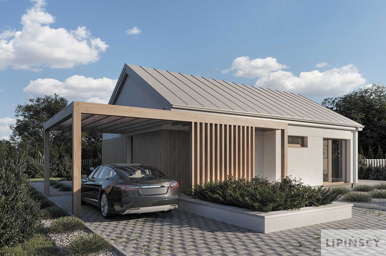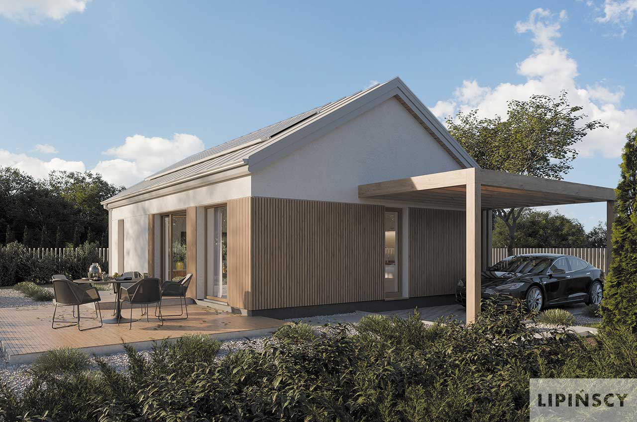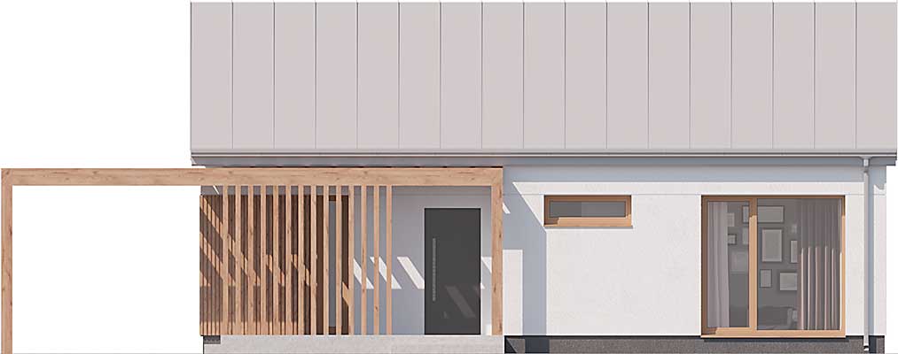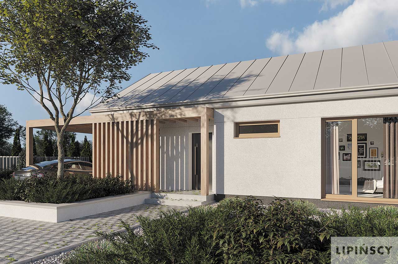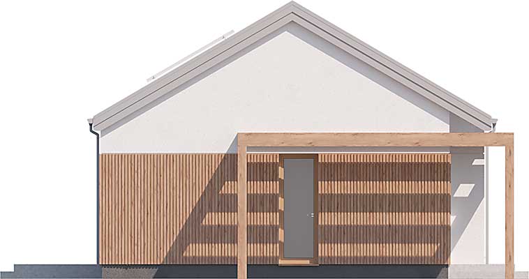 Projekt domu Tenna to niewielki energooszczędny dom parterowy z dwuspadowym dachem i ciekawą drewnianą pergolą wejściową z wiatą. Spore przeszklenia powiększają optycznie pomieszczenia i nadają bryle budynku nowoczesnego rysu. Minimalna powierzchnia komunikacyjna pozwala w pełni wykorzystać powierzchnię domu. Przestrzeń dzienna to salon z aneksem kuchennym, a w części nocnej znajdują się dwie sypialnie z łazienką. Przewidziana została osobna kotłownia z nowoczesną pompą ciepła i rekuperatorem, a w wiatrołapie zmieści się spora szafa ubraniowa.