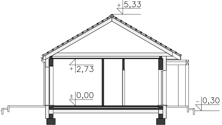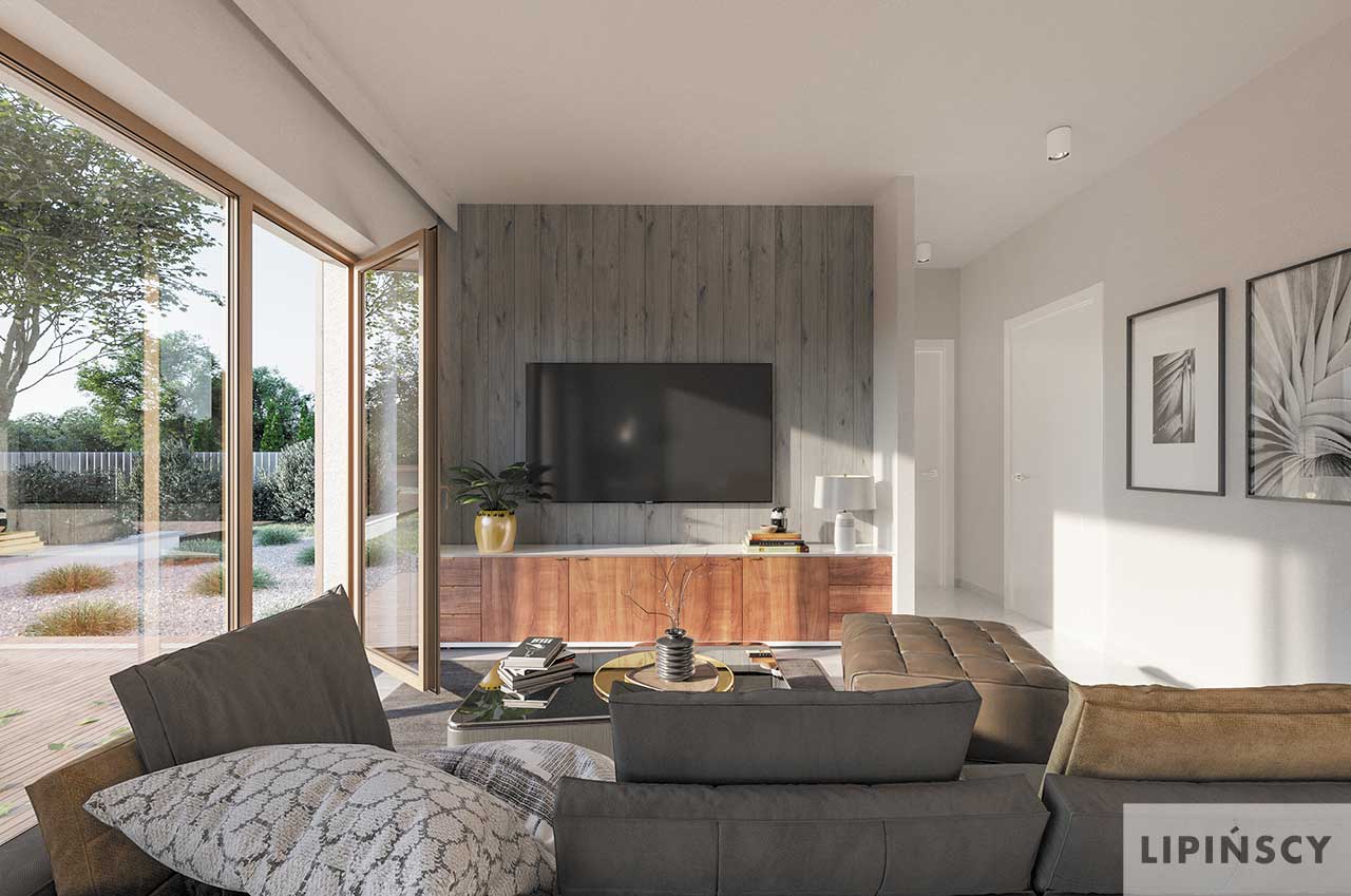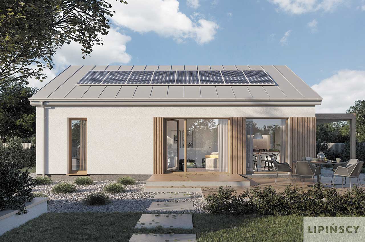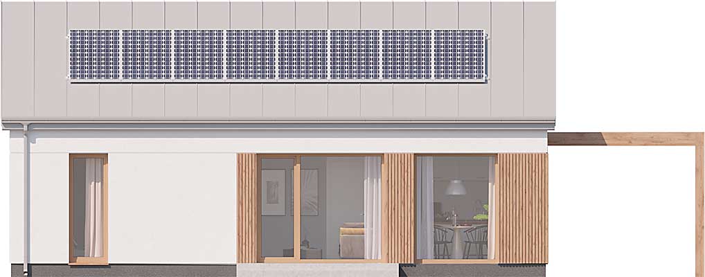 Projekt domu Tenna to niewielki energooszczędny dom parterowy z dwuspadowym dachem i ciekawą drewnianą pergolą wejściową z wiatą. Spore przeszklenia powiększają optycznie pomieszczenia i nadają bryle budynku nowoczesnego rysu. Minimalna powierzchnia komunikacyjna pozwala w pełni wykorzystać powierzchnię domu. Przestrzeń dzienna to salon z aneksem kuchennym, a w części nocnej znajdują się dwie sypialnie z łazienką. Przewidziana została osobna kotłownia z nowoczesną pompą ciepła i rekuperatorem, a w wiatrołapie zmieści się spora szafa ubraniowa.