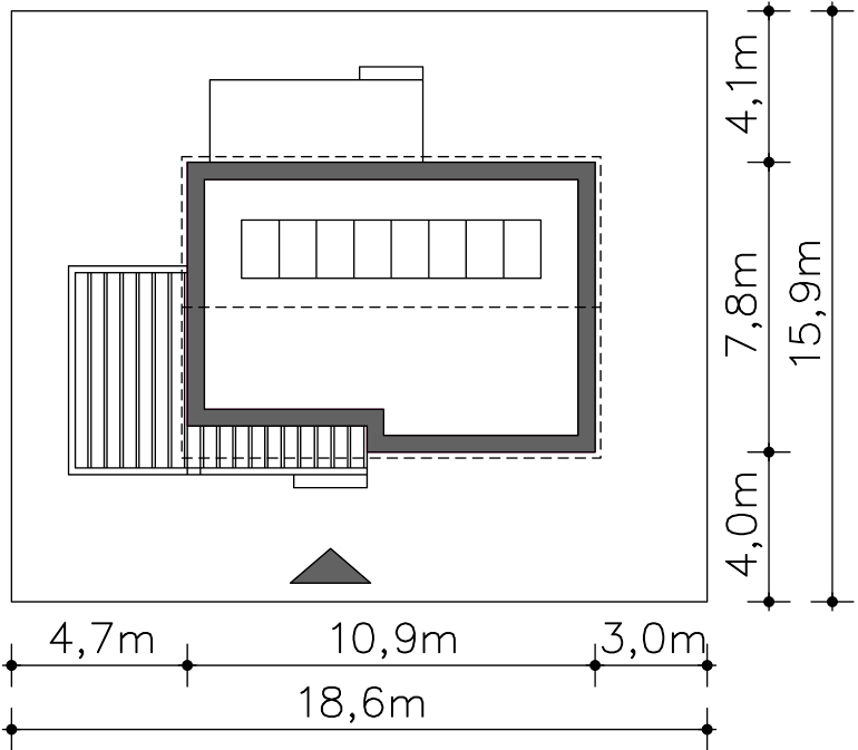 Grafika przedstawia minimalne wymiary działki. Aby sprawdzić, czy dom może być realizowany na konkretnej działce należy uzyskać Wypis i Wyrys z Miejscowego Planu Zagospodarowania Przestrzennego lub jeśli na danym terenie nie ma planu – Decyzję o warunkach zabudowy. Wszystkie projekty wymagają adaptacji do warunków miejscowych przez projektanta lokalnego.