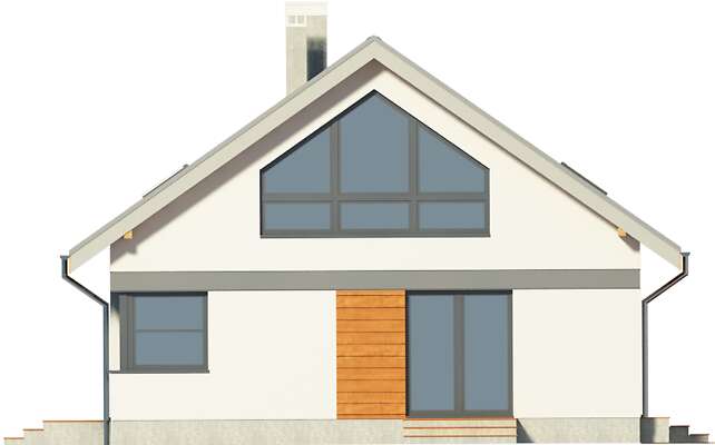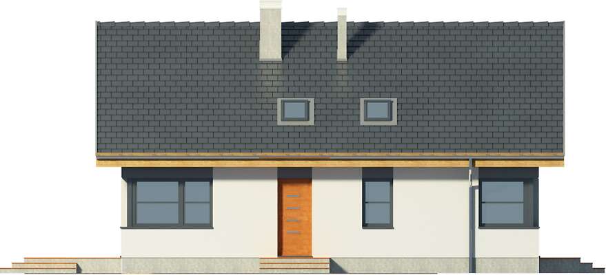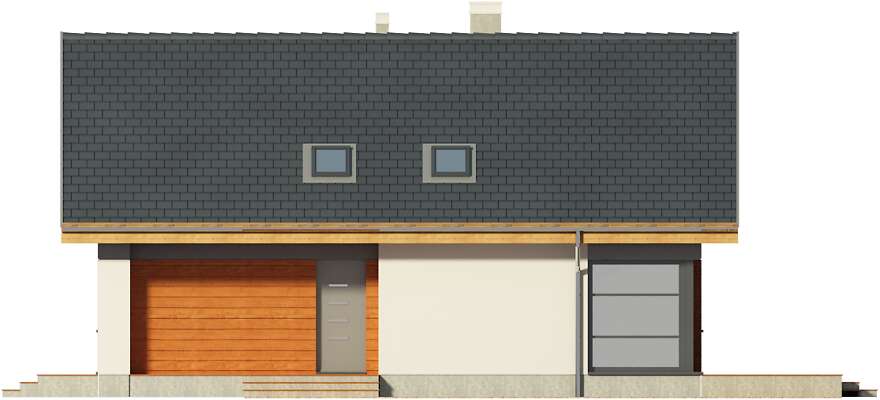 Ten projekt wyraźnie pasuje na działki z wjazdem od południa. Nowoczesny styl i prosto zarysowana bryła spodobają się miłośnikom czytelnych i prostych rozwiązań. Harmonijnie skomponowana elewacja z dodatkiem drewnianych elementów wykończenia jest lekka i czysta w odbiorze. Układ pomieszczeń to przestronna część dzienna, pięknie doświetlona oknami narożnymi. Dwie sypialnie na parterze pozwalają na etapową budowę domu. Plusem tego domu jest także to, że wszystkie pomieszczenia sanitarne są usytuowane w jednej części domu, co pozwala zaoszczędzić na instalacjach.