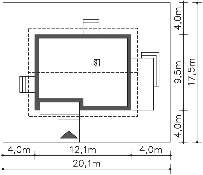 Grafika przedstawia minimalne wymiary działki. Aby sprawdzić, czy dom może być realizowany na konkretnej działce należy uzyskać Wypis i Wyrys z Miejscowego Planu Zagospodarowania Przestrzennego lub jeśli na danym terenie nie ma planu – Decyzję o warunkach zabudowy. Wszystkie projekty wymagają adaptacji do warunków miejscowych przez projektanta lokalnego.