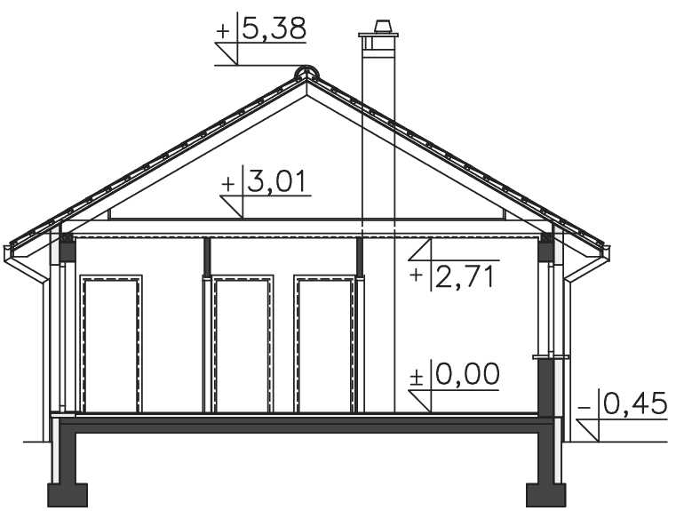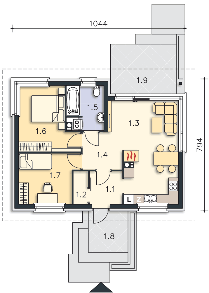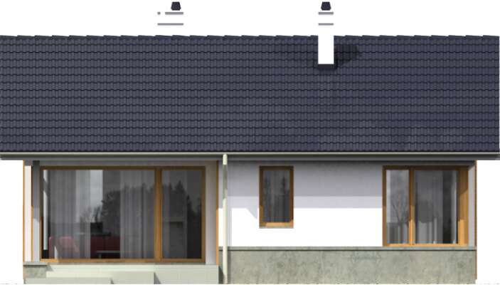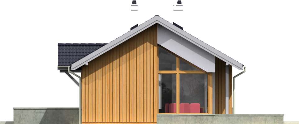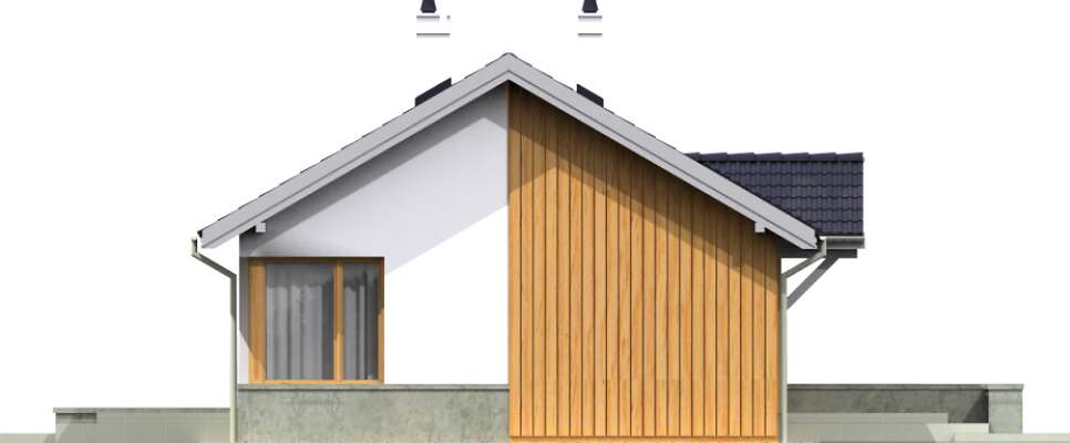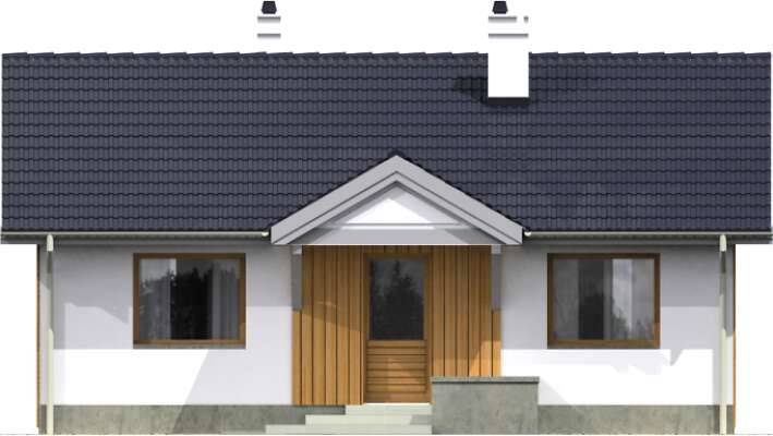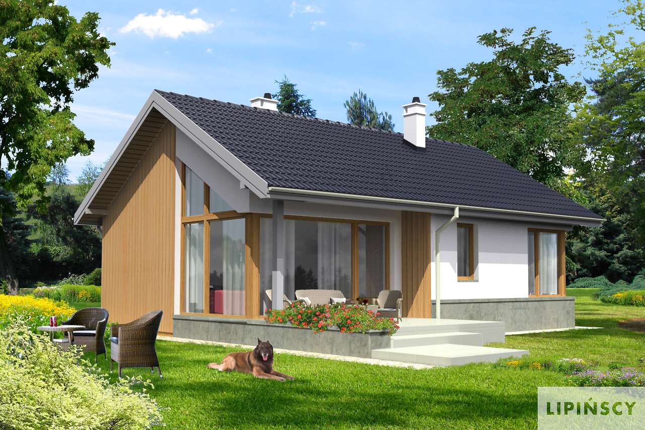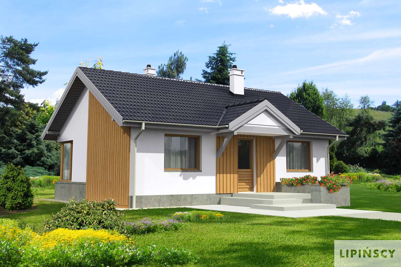 Mały, tani w budowie parterowy domek jednorodzinny. Posiada pięknie doświetlony salon z kominkiem, połączony z kuchnią i z wydzielonym kącikiem na stół jadalny oraz dwie sypialnie i łazienkę. Przy wejściu znalazło się miejsce na garderobę. Kocioł gazowy został umieszczony w łazience. Taki program funkcjonalny z dwiema sypialniami zapewni wygodę 3 osobowej rodzinie.