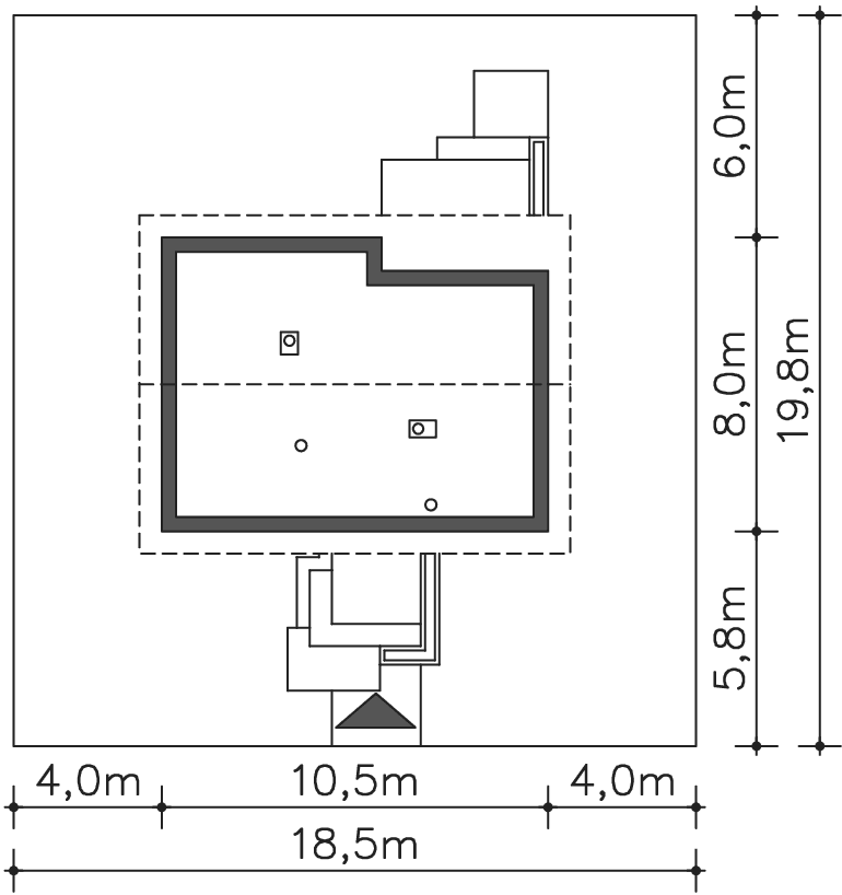 Grafika przedstawia minimalne wymiary działki. Aby sprawdzić, czy dom może być realizowany na konkretnej działce należy uzyskać Wypis i Wyrys z Miejscowego Planu Zagospodarowania Przestrzennego lub jeśli na danym terenie nie ma planu – Decyzję o warunkach zabudowy. Wszystkie projekty wymagają adaptacji do warunków miejscowych przez projektanta lokalnego.