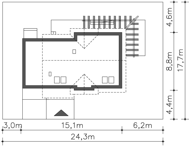 Grafika przedstawia minimalne wymiary działki. Aby sprawdzić, czy dom może być realizowany na konkretnej działce należy uzyskać Wypis i Wyrys z Miejscowego Planu Zagospodarowania Przestrzennego lub jeśli na danym terenie nie ma planu – Decyzję o warunkach zabudowy. Wszystkie projekty wymagają adaptacji do warunków miejscowych przez projektanta lokalnego.