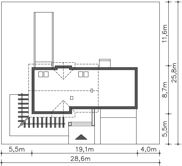 Grafika przedstawia minimalne wymiary działki. Aby sprawdzić, czy dom może być realizowany na konkretnej działce należy uzyskać Wypis i Wyrys z Miejscowego Planu Zagospodarowania Przestrzennego lub jeśli na danym terenie nie ma planu – Decyzję o warunkach zabudowy. Wszystkie projekty wymagają adaptacji do warunków miejscowych przez projektanta lokalnego.