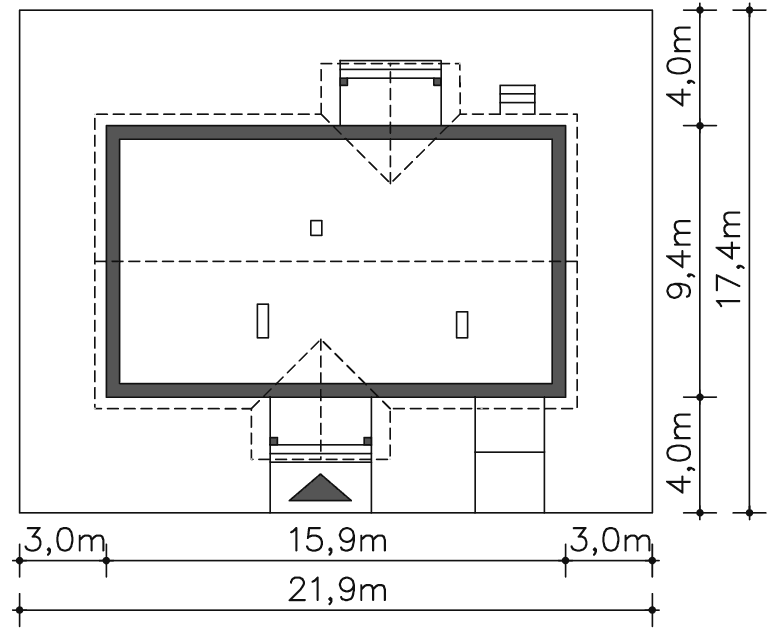 Grafika przedstawia minimalne wymiary działki. Aby sprawdzić, czy dom może być realizowany na konkretnej działce należy uzyskać Wypis i Wyrys z Miejscowego Planu Zagospodarowania Przestrzennego lub jeśli na danym terenie nie ma planu – Decyzję o warunkach zabudowy. Wszystkie projekty wymagają adaptacji do warunków miejscowych przez projektanta lokalnego.