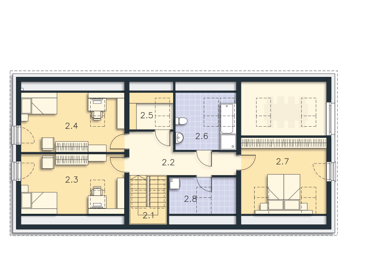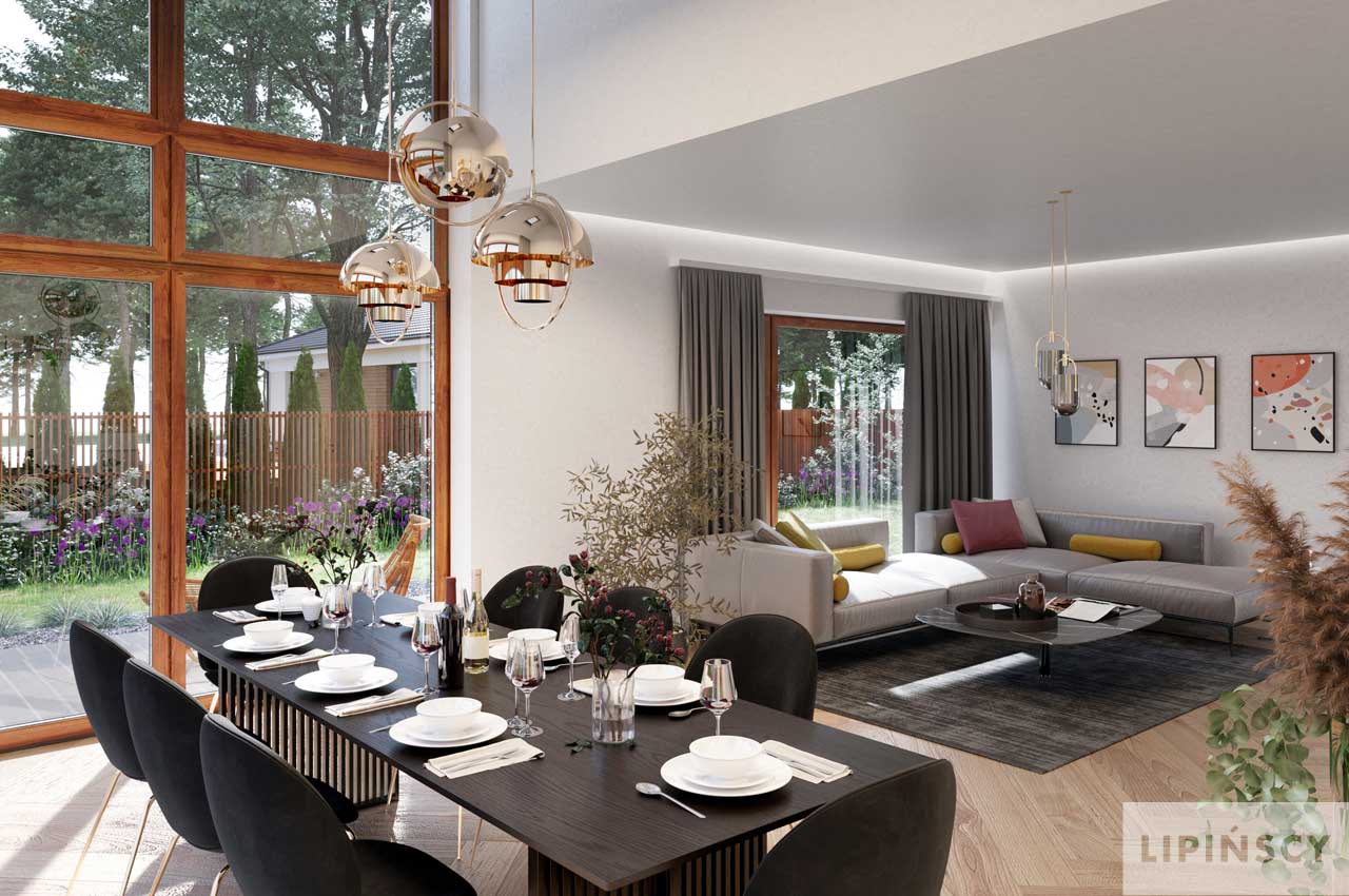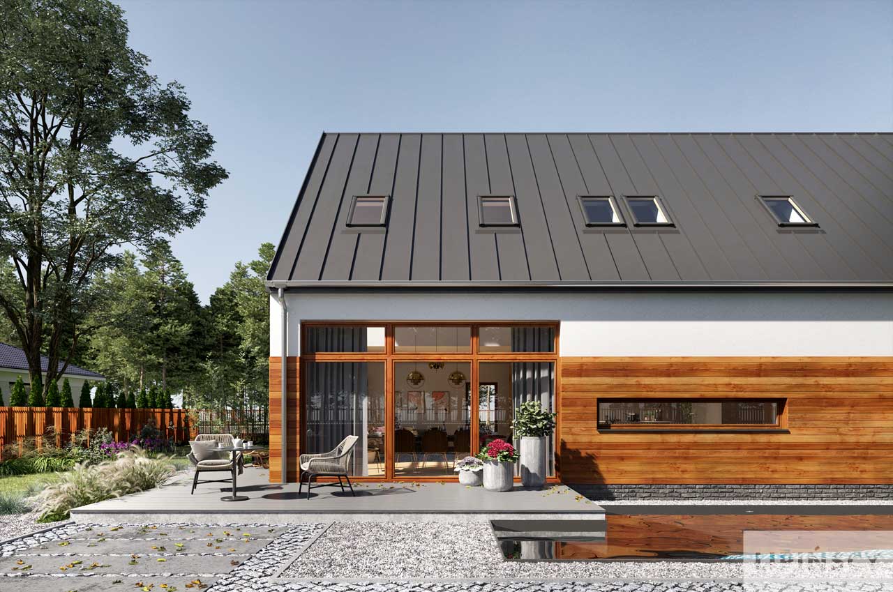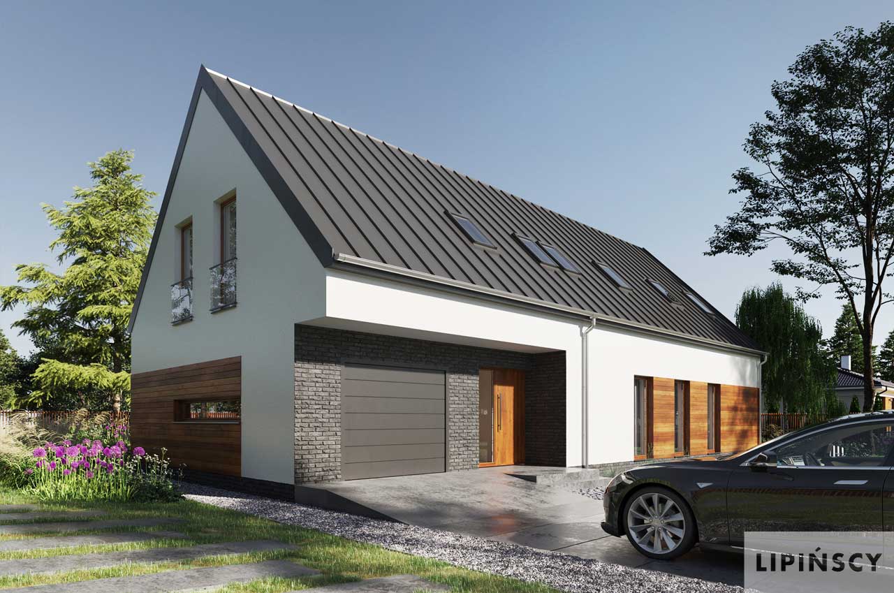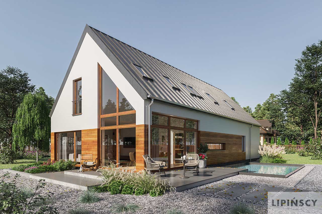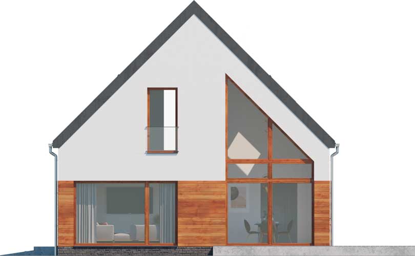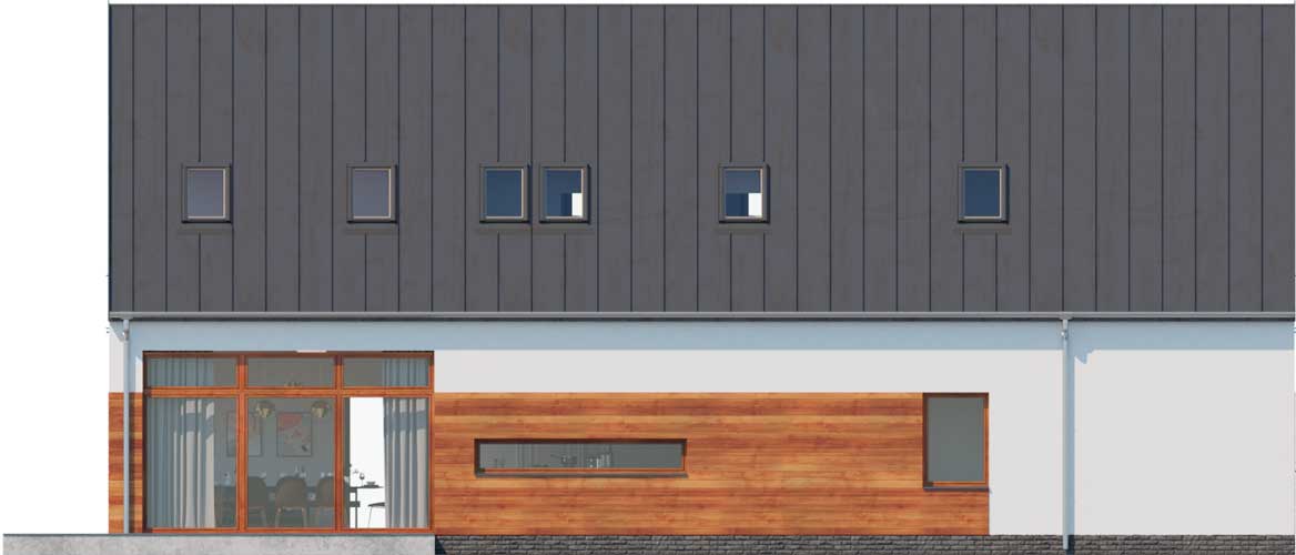 Wersja domu Trogir DCP406 z przeznaczeniem na szeroką działkę. Przestronna, dobrze doświetlona część dzienna z salonem, jadalnią, kuchnią i spiżarnią tworzy doskonałe miejsce do udanego spędzania czasu całą rodziną. Jest tu też miejsce do pracy w gabinecie, który w razie potrzeby może stać się także wygodnym pokojem gościnnym. Część nocna na poddaszu obejmuje trzy sypialnie (dwie takie same i jedną większą po przeciwnej stronie), łazienkę, pralnię i garderobę. Do kotłowni dostaniemy się z garażu, do którego wejście jest bezpośrednio z wiatrołapu. W projekcie przewidziano ogrzewanie pompą ciepła oraz rekuperację.