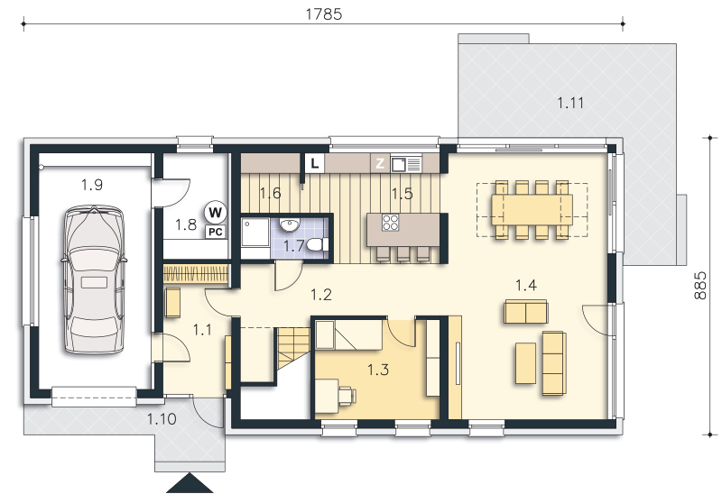 Grafika przedstawia minimalne wymiary działki. Aby sprawdzić, czy dom może być realizowany na konkretnej działce należy uzyskać Wypis i Wyrys z Miejscowego Planu Zagospodarowania Przestrzennego lub jeśli na danym terenie nie ma planu – Decyzję o warunkach zabudowy. Wszystkie projekty wymagają adaptacji do warunków miejscowych przez projektanta lokalnego.