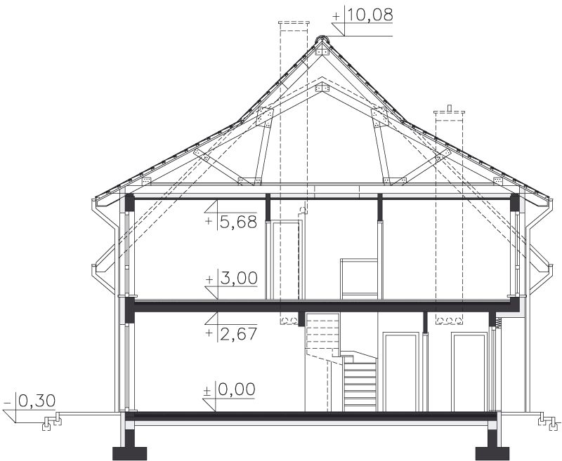 Dach - wiązary, pokrycie: dachówka cementowa lub ceramiczna