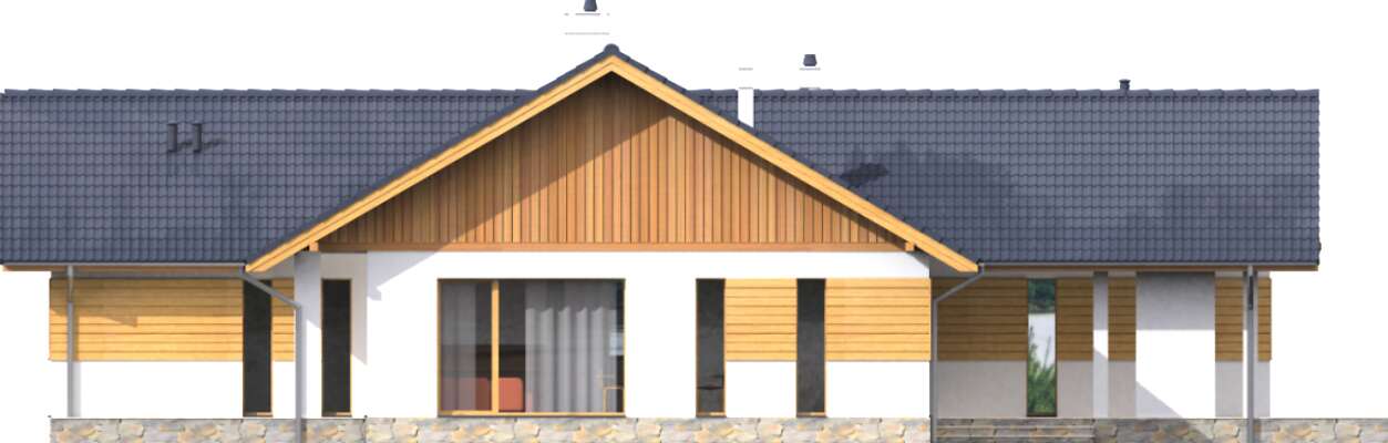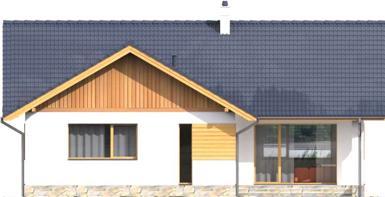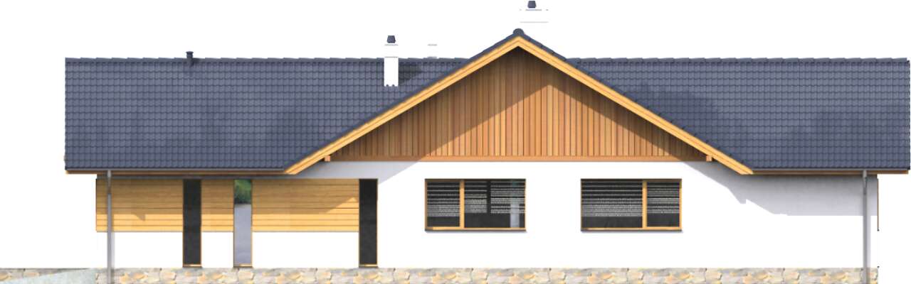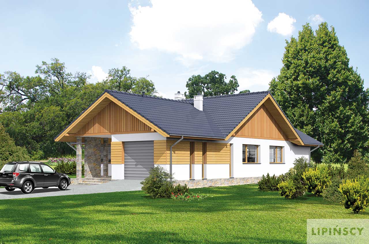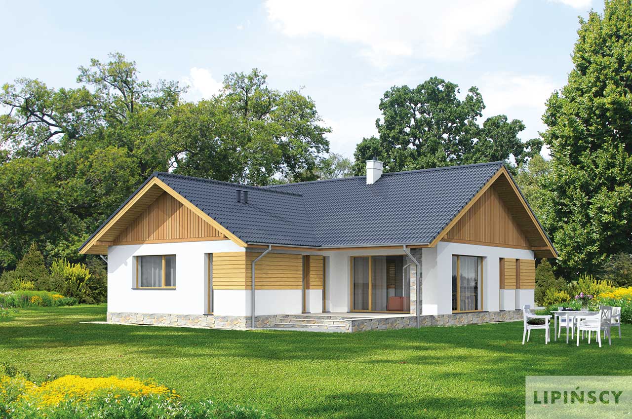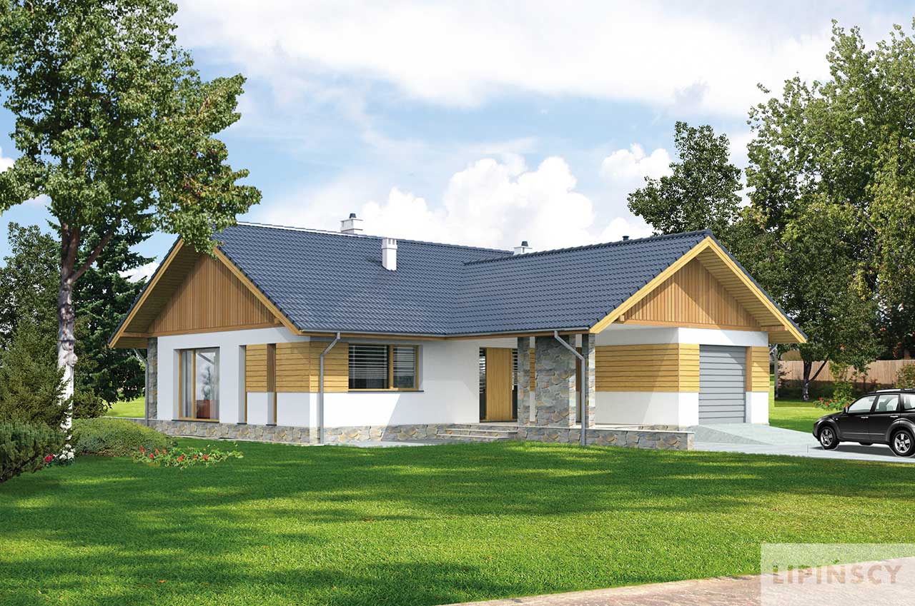 Tradycyjny dom parterowy o wydłużonej bryle, która została zaprojektowana z myślą o węższych działkach. W takim układzie w domu wygodnie zmieści się garaż z praktycznym przejściem przez kotłownię do wiatrołapu. Za nimi znajduje się osobna strefa prywatna z trzema ustawnymi sypialniami, a ostatnia to apartament małżeński z własną łazienką i garderobą. Część dzienna to otwarta przestrzeń salonu, dużej kuchni, w której można zastosować tzw. wyspę oraz jadalnią, która łączy funkcjonalnie oba pomieszczenia. Na uwagę zasługuje także zadaszony taras. Wszystkie pomieszczenia są ładnie oświetlone światłem naturalnym, z wyjątkiem małego pomieszczenia pomocniczego, który znajduje się w środku domu.