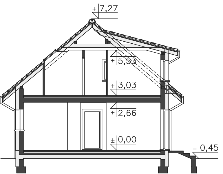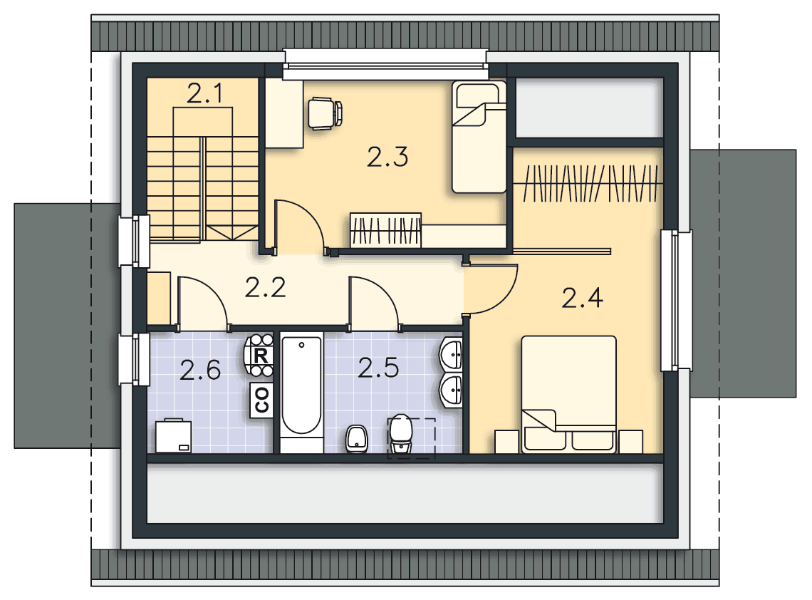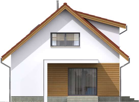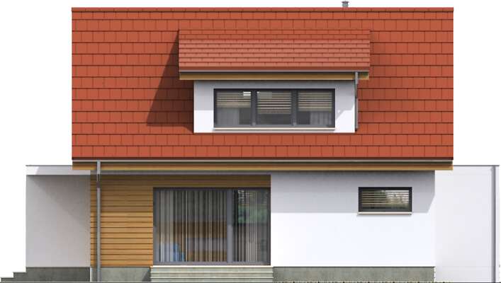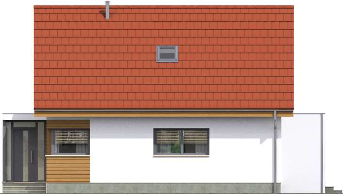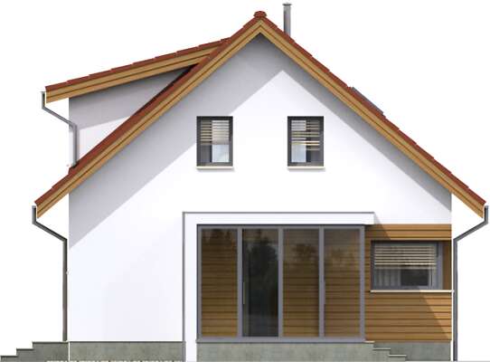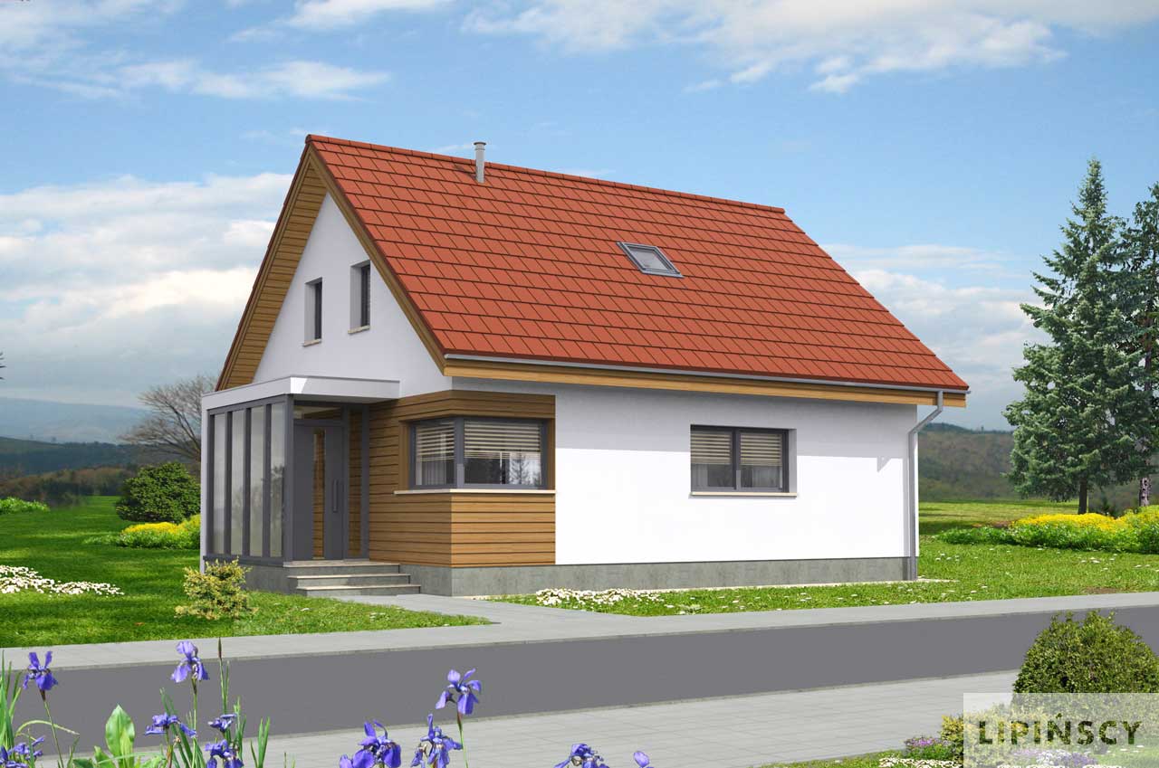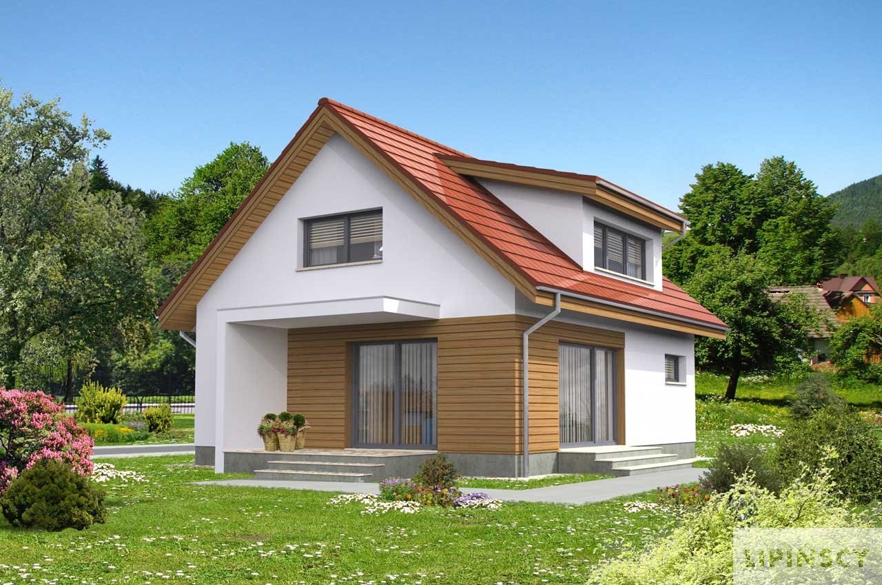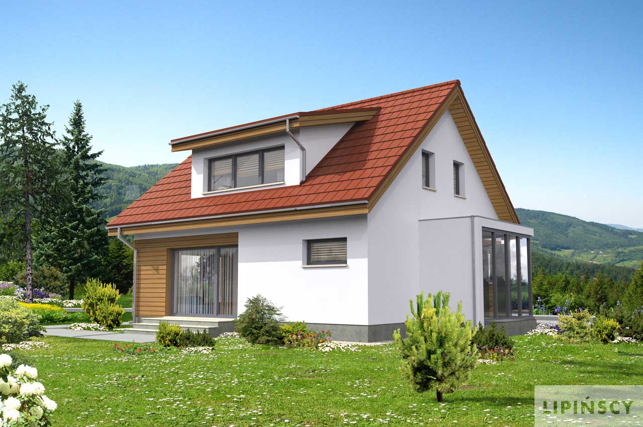 Energooszczędny dom z użytkowym poddaszem o nowoczesnym wyglądzie, co podkreślone zostało ciekawie zaaranżowanym wejściem i drewnianymi elementami elewacji. Atutem domu jest duża, ustawna kuchnia ze spiżarnią. Na parterze znajduje się również salon z dwoma wyjściami na taras, dodatkowy pokój i łazienka. Poddasze podzielono między dwie sypialnie, łazienkę i pomieszczenie gospodarcze, mogące służyć jako pralnia lub schowek. Dzięki zastosowaniu podłużnej lukarny, w pokoju na poddaszu jest więcej miejsca niż przy tradycyjnych skosach.