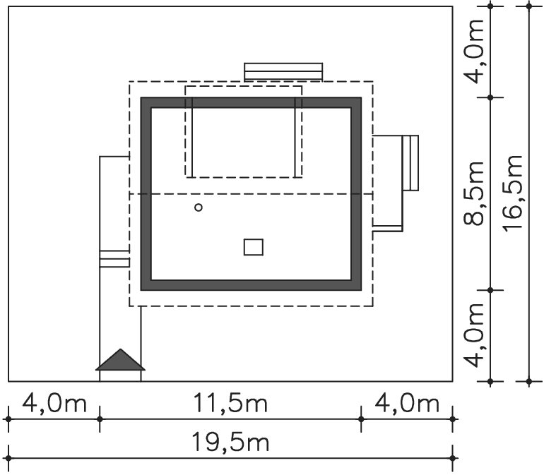 Grafika przedstawia minimalne wymiary działki. Aby sprawdzić, czy dom może być realizowany na konkretnej działce należy uzyskać Wypis i Wyrys z Miejscowego Planu Zagospodarowania Przestrzennego lub jeśli na danym terenie nie ma planu – Decyzję o warunkach zabudowy. Wszystkie projekty wymagają adaptacji do warunków miejscowych przez projektanta lokalnego.